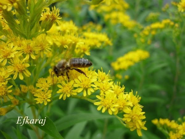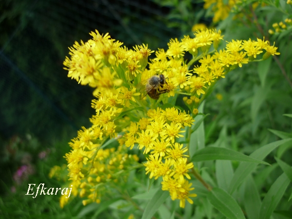 Najpospolitsza i dość niebezpieczna, zaliczana do najbardziej ekspansywnych gatunków obcych, przywleczonych do nas i łatwo się rozprzestrzeniających. Gdy się jej nie dopilnuje - nawłoć kanadyjska (Solidago canadensis), szybko rozprzestrzeni się nie tylko po naszym ogrodzie, ale i sąsiadów. Okoliczne nieuzytki aż się od niej roją, więc normalną koleją rzeczy trafi tez do mnie. Po przekwitnięciu usuwam kwiatostany a póki kwitnie, jest tłumnie oblegana przez owady.
