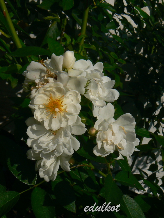 Kwiaty: białe, podwójne, drobne, 1,5-2 cm, kwitnie w bukietach cały sezon, samoczyszcząca,