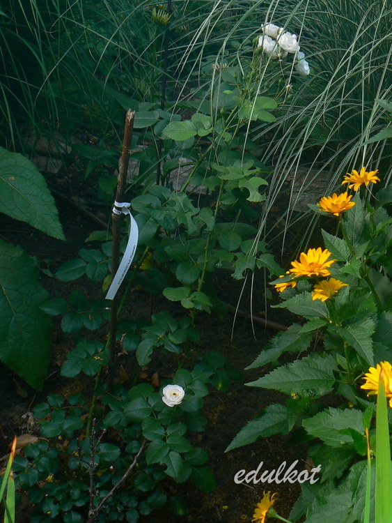 Ewidentnie musi mieć podporę bo cienkie i wiotkie pędy 'żyją swoim życiem', dobrze że ma mocnych sąsiadów.