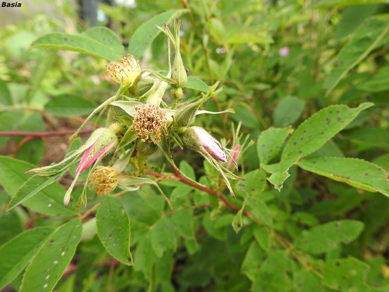 Kwitnienie zaczyna się później niż u innych róż, ale za to rozciąga się w czasie aż do jesieni. U mnie nigdy nie ma efektu wow!, może dlatego, że krzew posadzony jest w półcieniu. Tym niemniej, radzi sobie dzielnie i cieszy oko: najpierw kwiatami, potem zmieniającą barwę szatą liści, w końcu czerwonymi, kulistymi owocami.