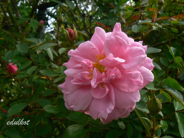 Kwiaty duże, półpełne do pełnych, różowe. Literatura wspomina o niezbyt doskonałym kształcie kwiatów, czego nie potwierdzam. Niestety, nie mogę również potwierdzić informacji o korzennym zapachu, enigmatycznie stwierdzę tylko, że róża wygląda, jakby pachniała