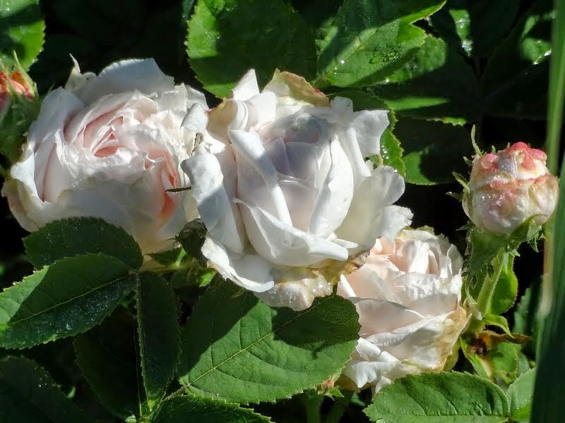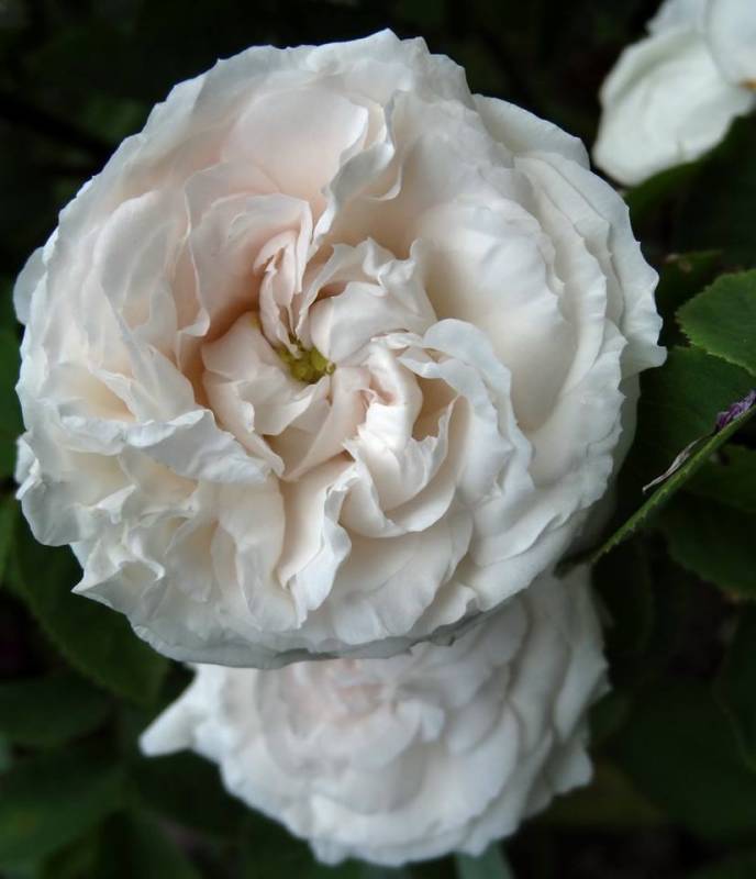 Kwiaty białe z odcieniem różu. Bardzo pełne o budowie ćwierćrozetowej średnicy ok. 8 cm. Pachnie bardzo mocno.