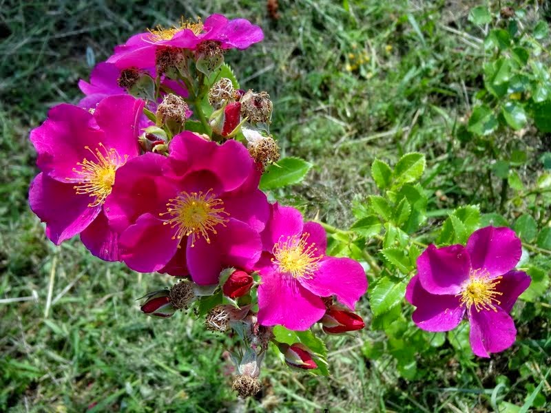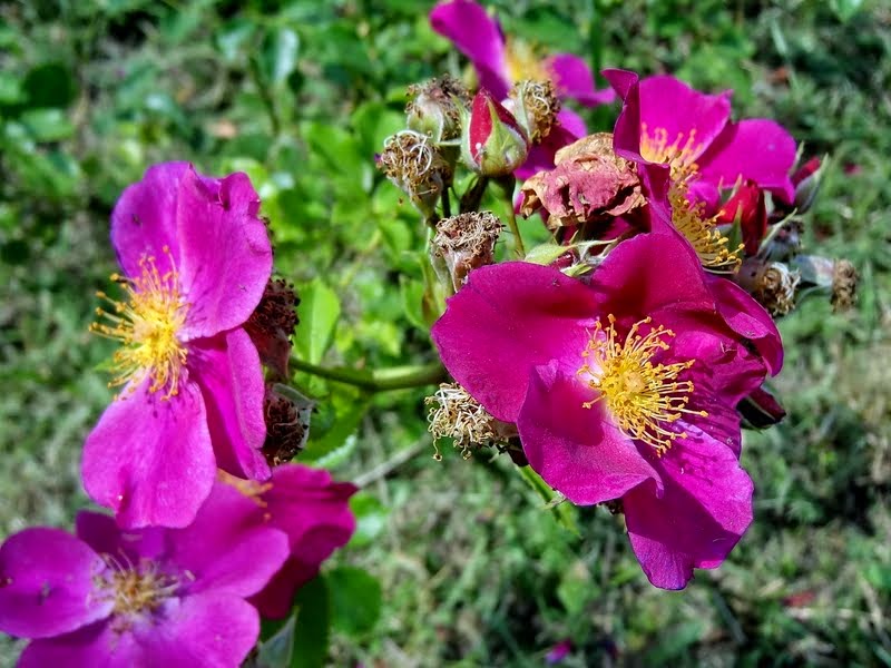 Kwiaty pojedyncze purpurowe ze złotymi pręcikami o wielkości do 6 cm. Zapach umiarkowany. Kwitnie bukietami kwiatów przez cały sezon.