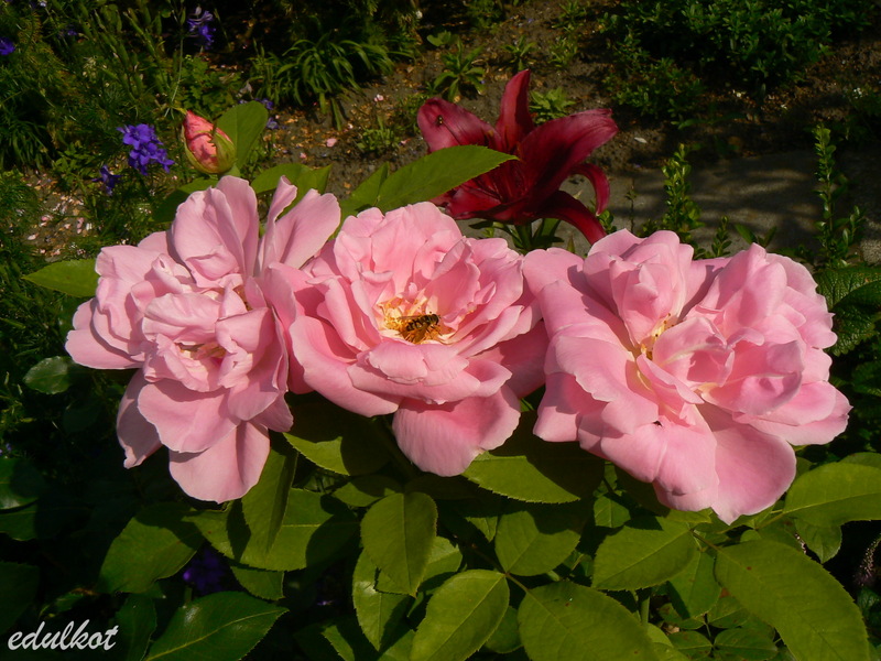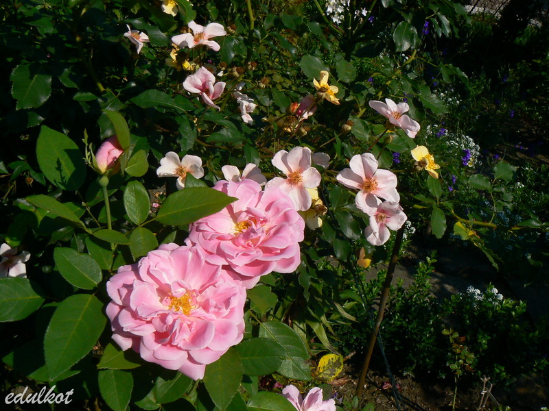 Troszkę lepiej było w tym sezonie, kwitła kilkukrotnie ale jak to ona ma kwiatki szybko przekwitały, zwłaszcza w tegorocznych upałach. Mocno zdominowana przez sąsiadki rosnące zdecydowanie za wielkie, ledwie zipała od ich uścisków, ale trzeba przyznać że taki zestaw jest ładny.