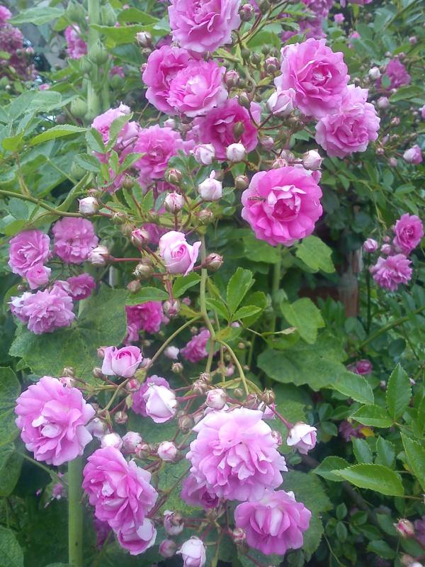 Kwiaty drobne, pełne, do 4 cm średnicy, różowe o lawendowym odcieniu, zebrane w grube klastry.