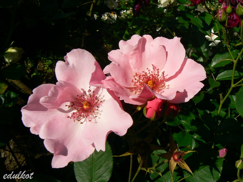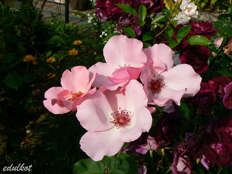 Kwiaty: różowołososiowe, średnie, ok. 9 cm, pojedyncze (4-8 płatków), płaskie, odsłaniają pylniki w rdzawoczerwonym kolorze, powtarza kwitnienie,