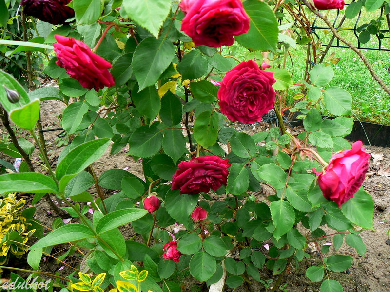 Kwiaty: ciemnoczerwone do purpurowych, ćwierć-rozetowe, duże średnicy 10 cm, pełne (ok. 50 płatkó), słabo powtarza,