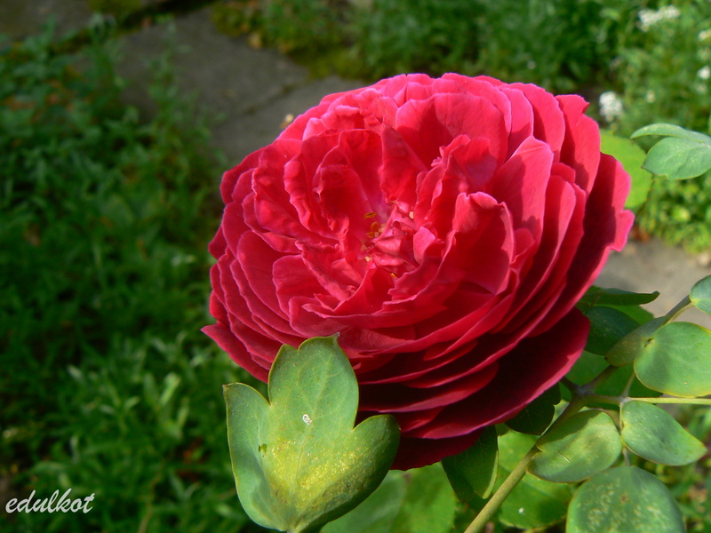 Kwiaty: czerwono-purpurowe, duże, pełne (ok. 40 płatków), w rozkwicie przypominają kwiat goździka, ma wyjątkowo duże pąki, powtarza, kwitnie przeważnie pojedynczym kwiatem na pędzie,