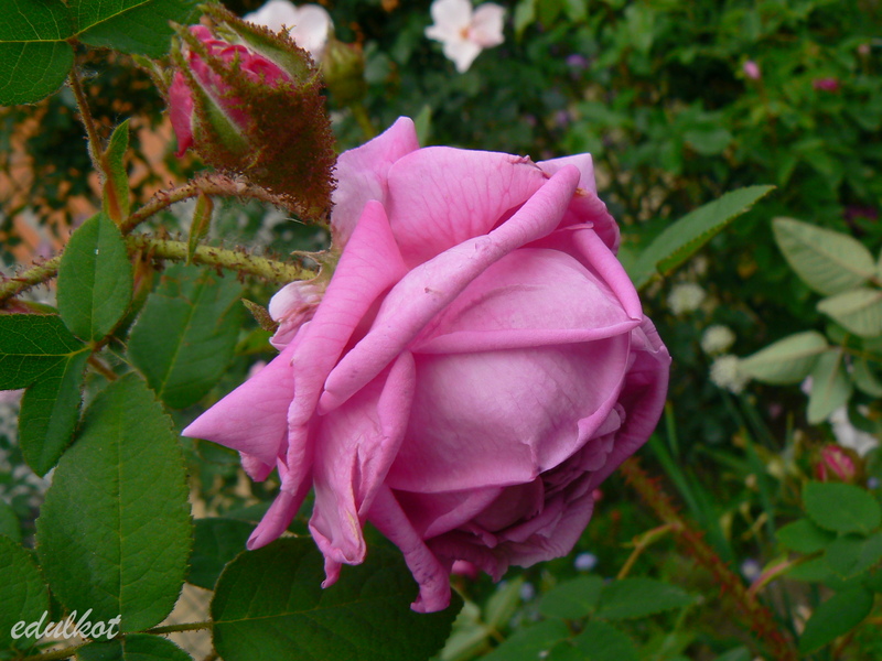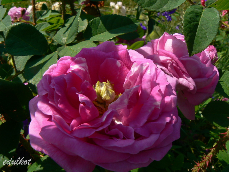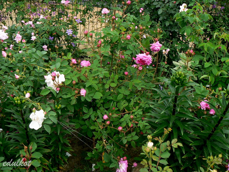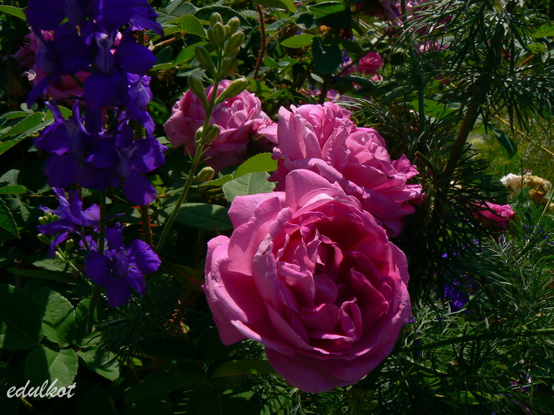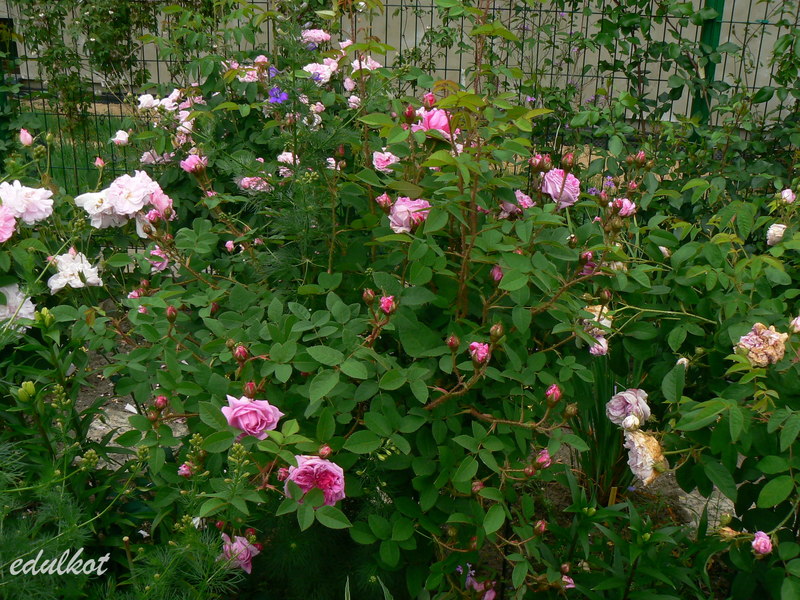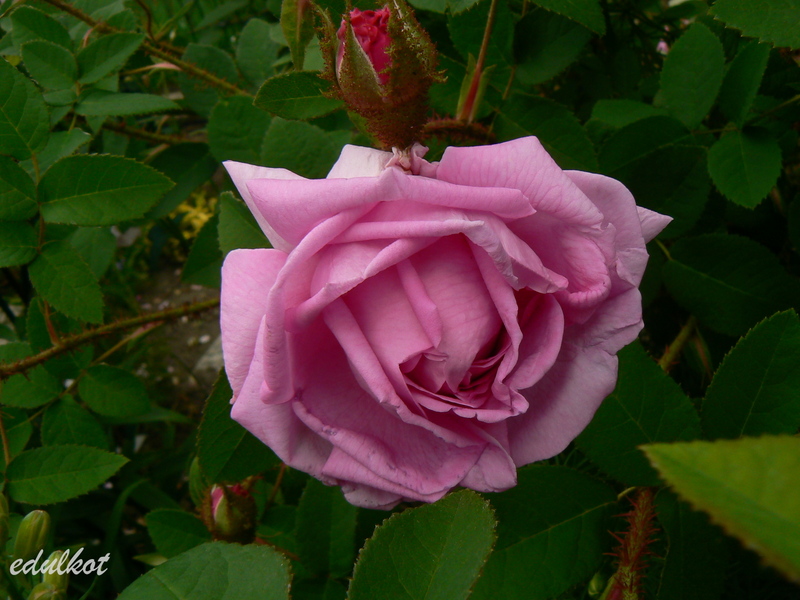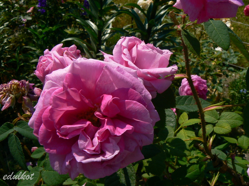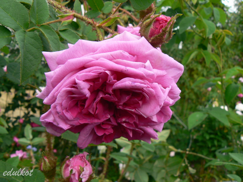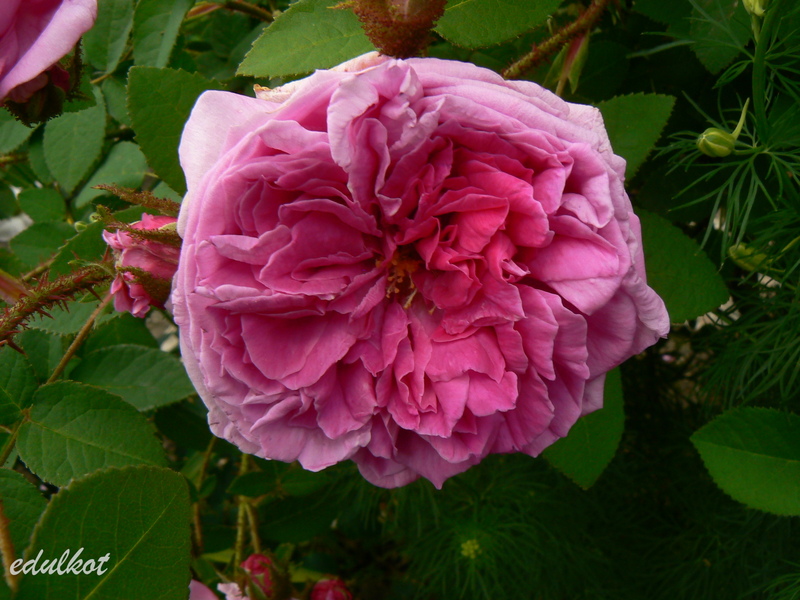 Kwiaty: duże, ćwierćrozetowe, pełne (do 50 płatków), różowe do karminowo różowych, w przekwicie przechodzą w fioletowe, rewersy mlecznoróżowe, lub wiśniowo-purpurowe, kwitnie raz,