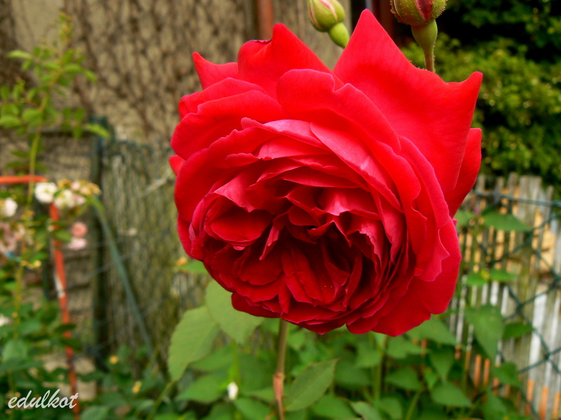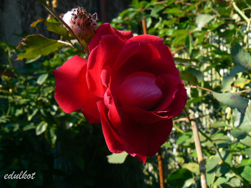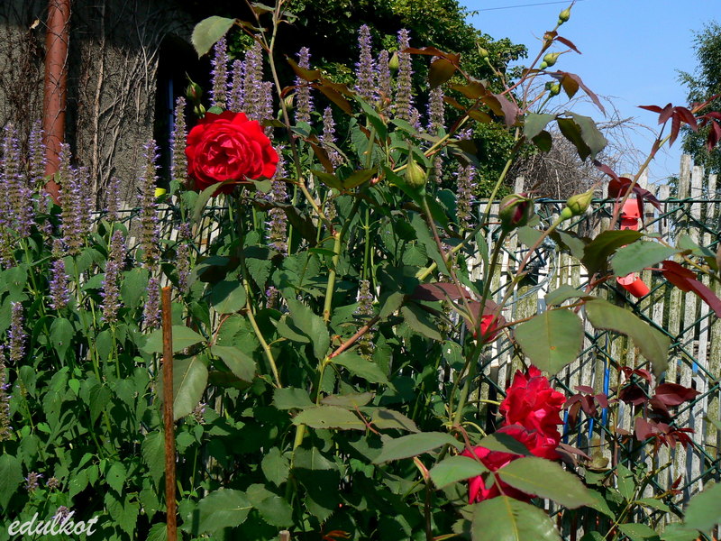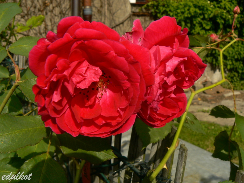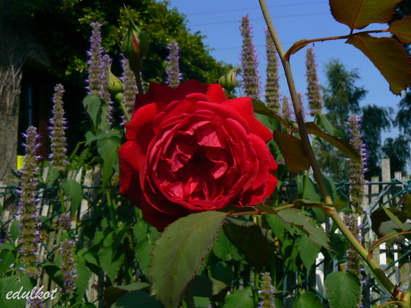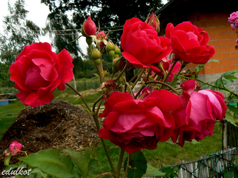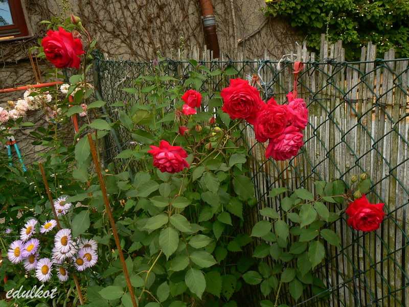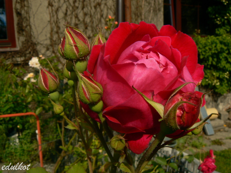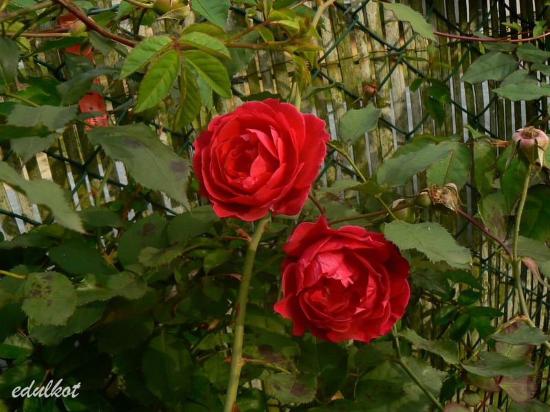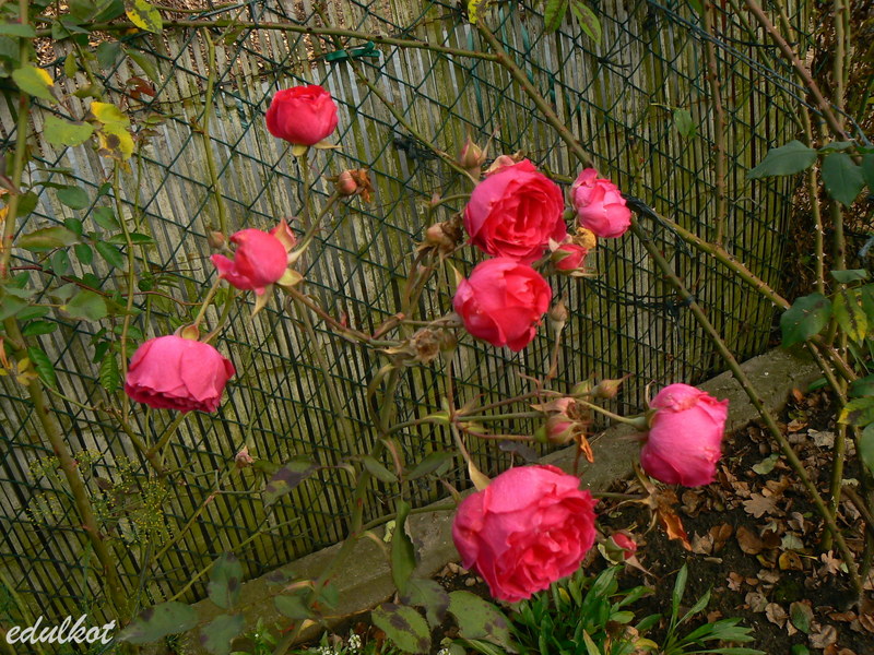 Przesadzałam ją z konieczności cieplejszego stanowiska, bardzo szybko nadrobiła straty i wyrosła na spory krzak. Jak to Geschwindka cierpi na czarną plamistość i pomimo gołych pędów śmiało kwitnie.