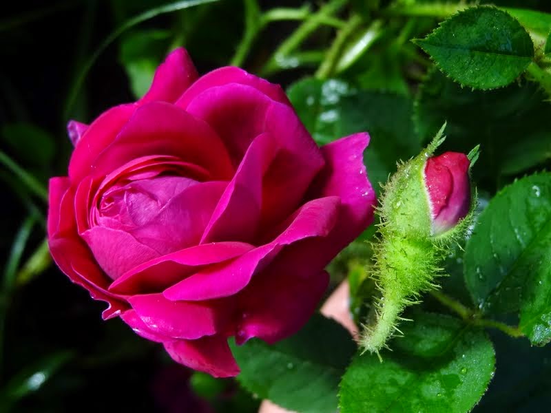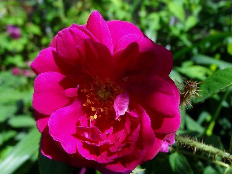 Kwiaty: średnie ok. 6-7,5 cm, półpełne, ciemno różowe poprzez liliowe do czerwonych, w rozkwicie pokazuje żółte pręciki, pąki okryte zielonym mchem, kwitnie raz choć podobno czasami powtarza, zawiązuje owoce,