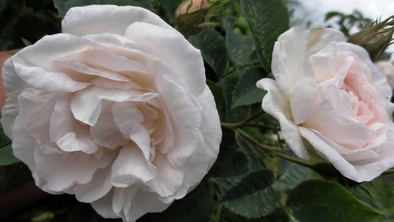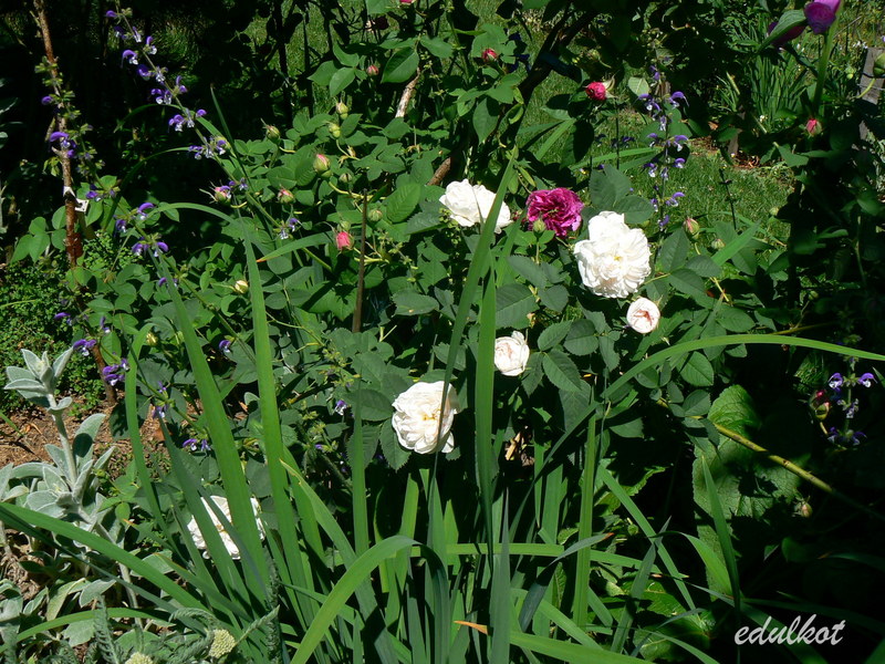 Kwiaty: białe początkowo różowawe, średnie ok. 5-7 cm, podwójne, dość luźne, kwitnie raz, podczas deszczu kwiaty mają skłonność do mumifikacji,