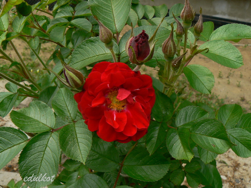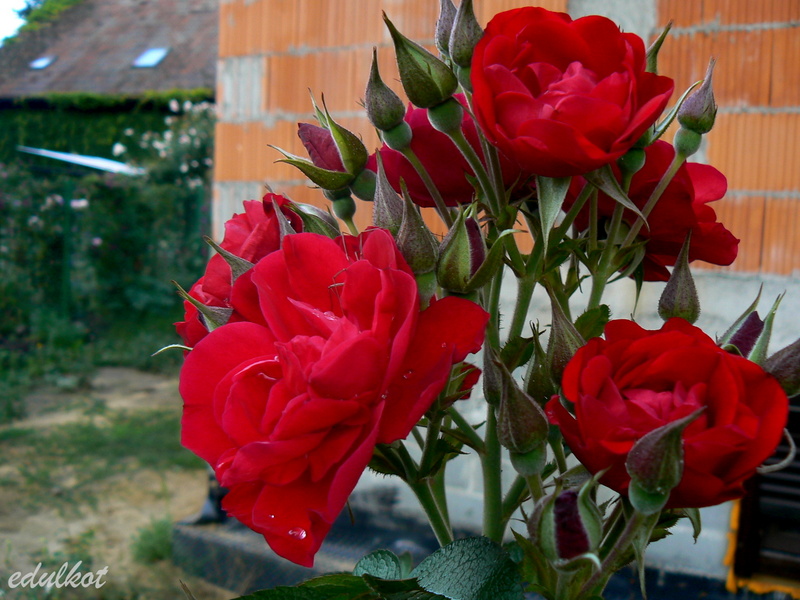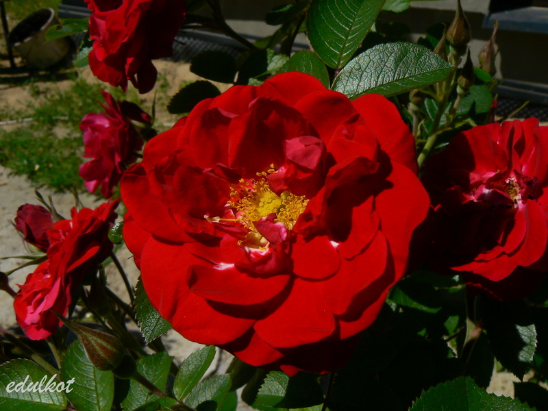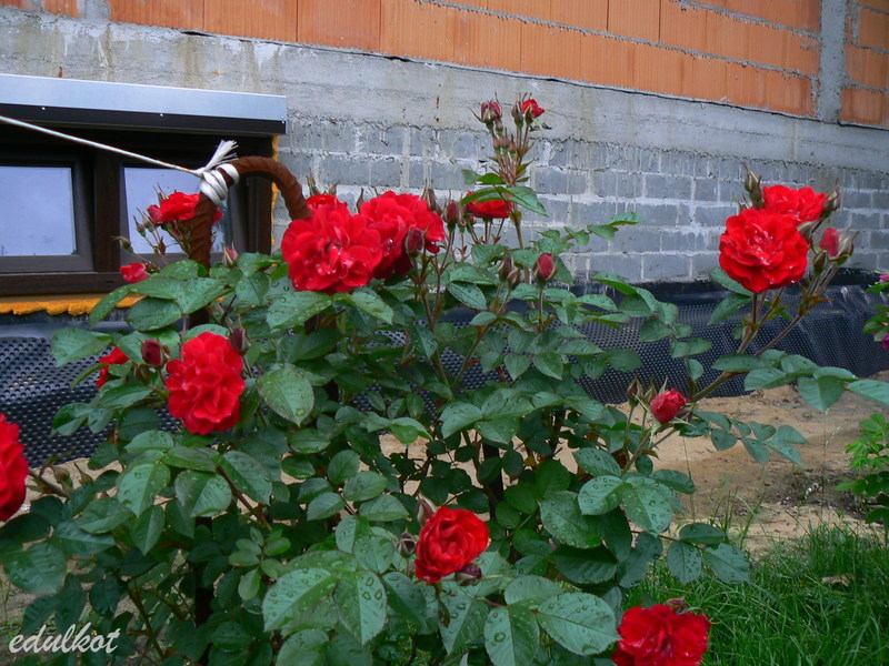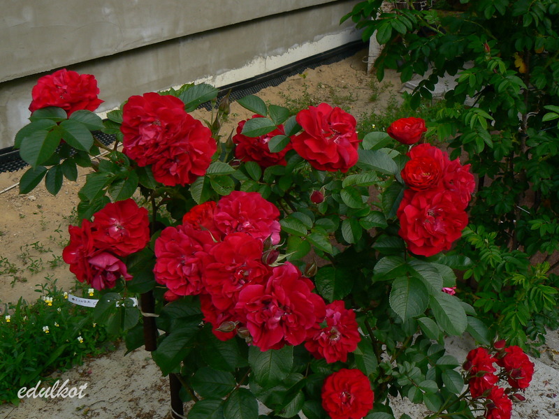Kwiaty: czysto czerwone, średnie ok. 7 cm., półpełne (17-25 płatków), kwitnie w dużych kiściach, powtarza kwitnienie