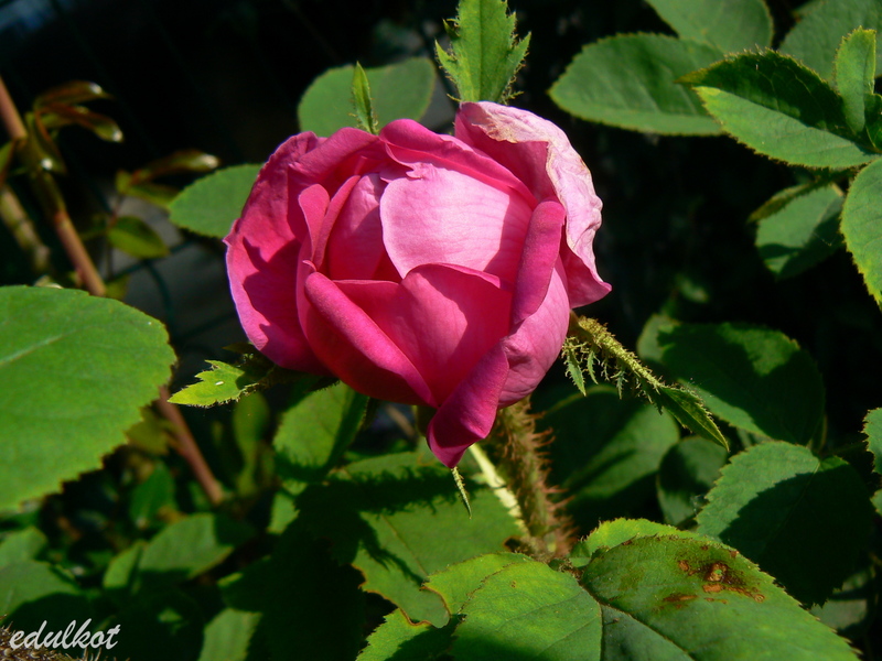 Kwiaty: ciemno różowe do amarantowego, średnie ok. 7-8 cm, pełne (26-40 płatków), pączki pokryte zielonym i lepkim omszeniem, może powtarzać kwitnienie w sprzyjających warunkach pogodowych.