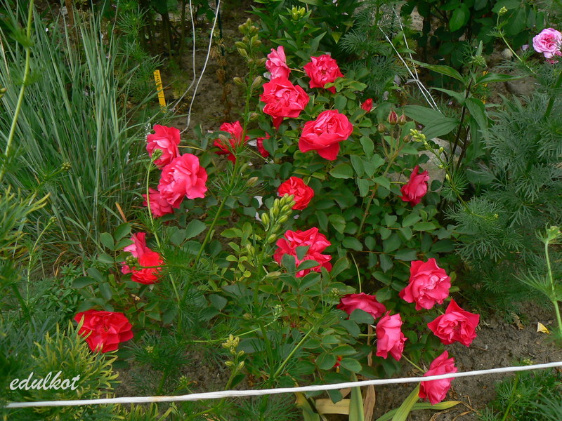 Kwiaty: karminowo-różowe, średnie ok. 6-7 cm, pojedyncze i półpełne (16-25 płatków), kwitnie bukiecikami całe lato, sporadycznie powtarza,