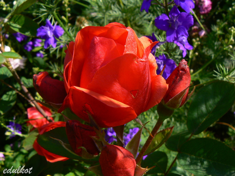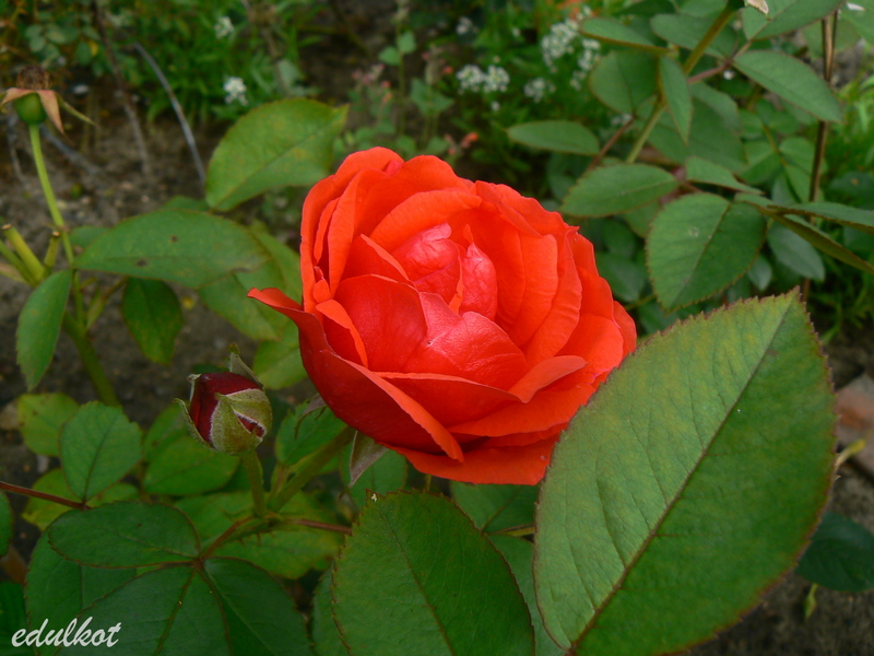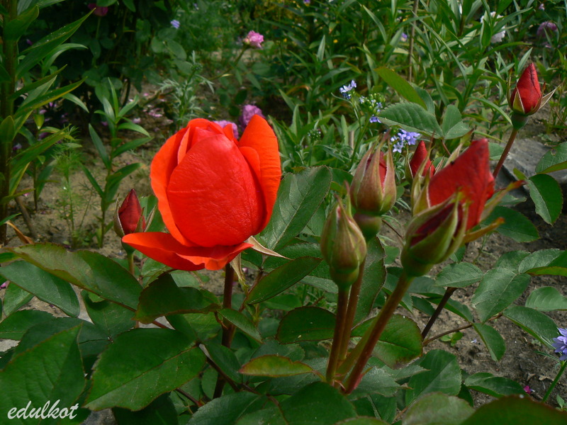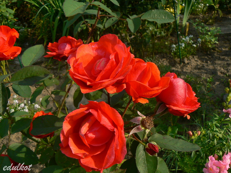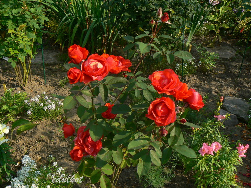 Kwiaty: pomarańczowo-czerwone do czerwonych, średnie ok. 5-6 cm, półpełne (20-25 płatków), miseczkowate, kwitnienie małymi bukiecikami cały sezon, najsłabiej kwitnąca z całej serii zwłaszcza w drugiej części sezonu, związuje duże owoce,