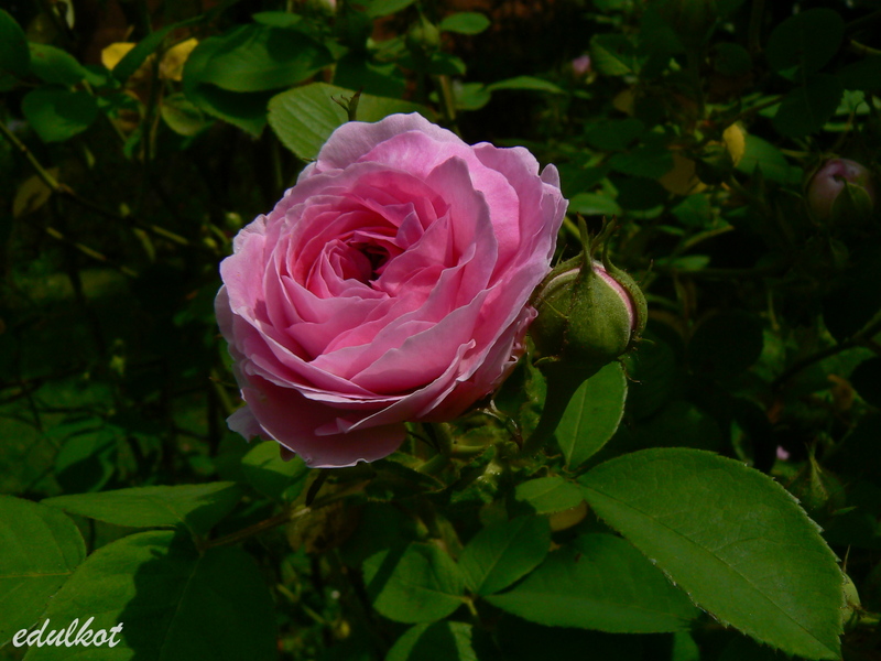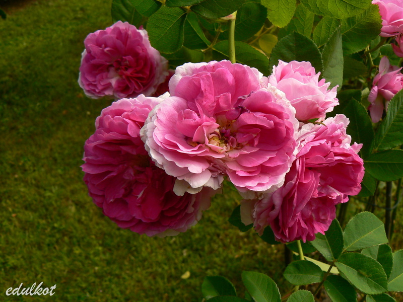 Kwiaty: karminowo-różowe jaśniejące w miarę rozkwitu, centrum ciemniejsze, średnie, pełne, ćwierć-rozetowe, pół-koliste do płaskich, kwitnie tylko raz;