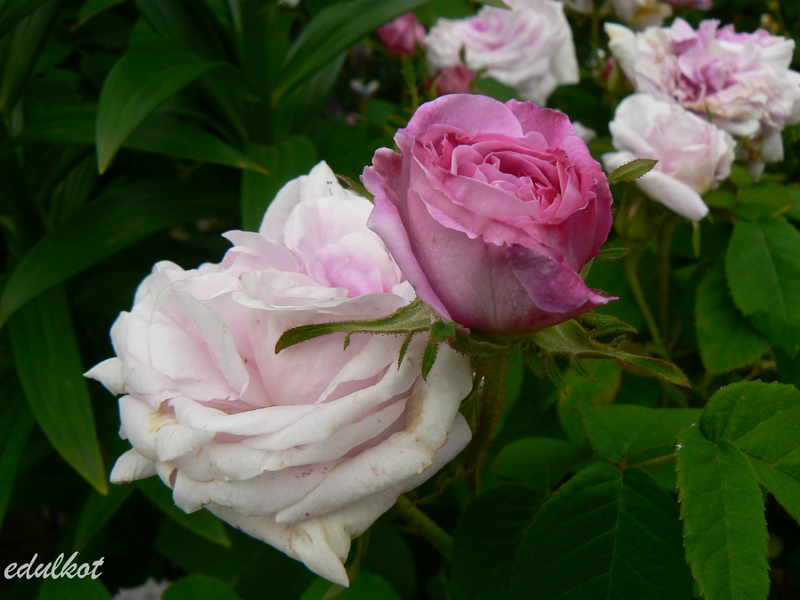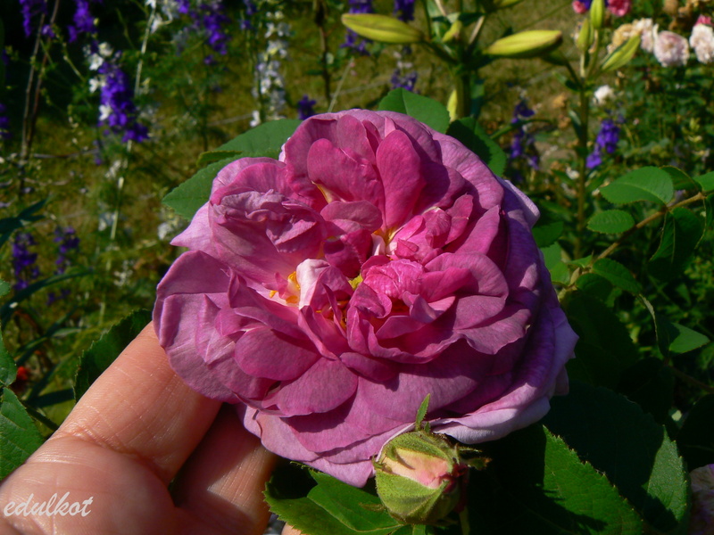 Kwiaty: duże, bardzo pełne, ćwierćrozetowe, fioletowo-różowego do karminowych z jaśniejszą krawędzią, bardzo zmienne, ta róża jest artystą metamorfozy, może przybierać różne formy, kwitnie raz;