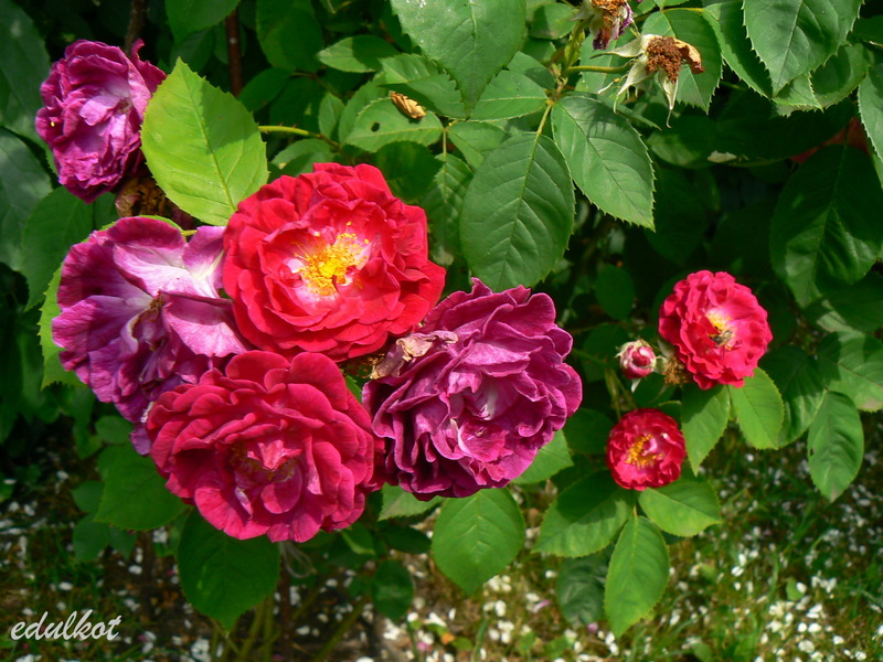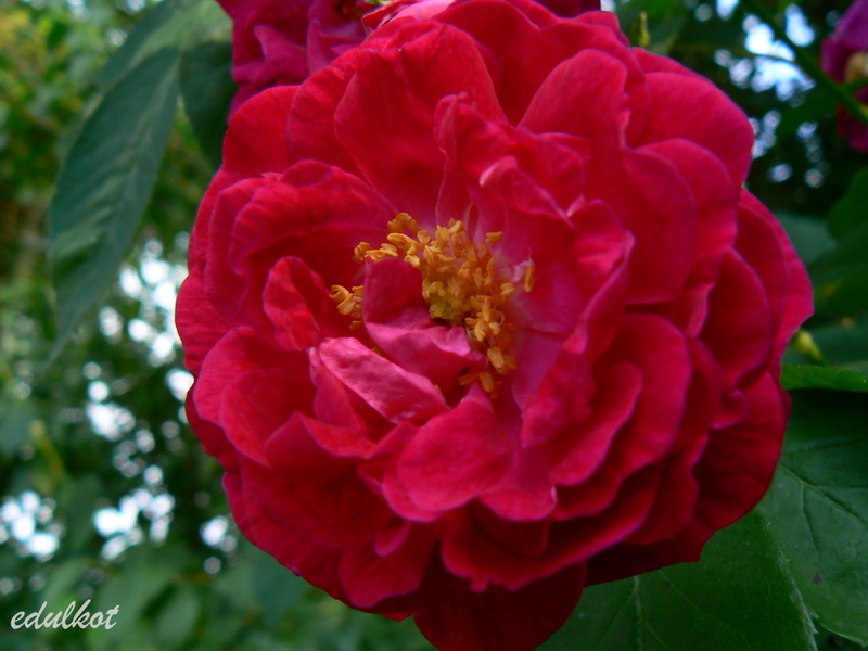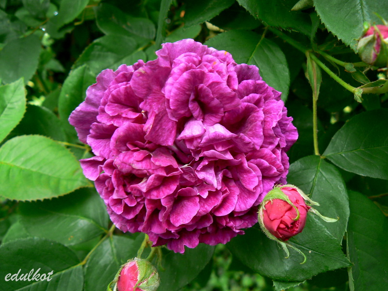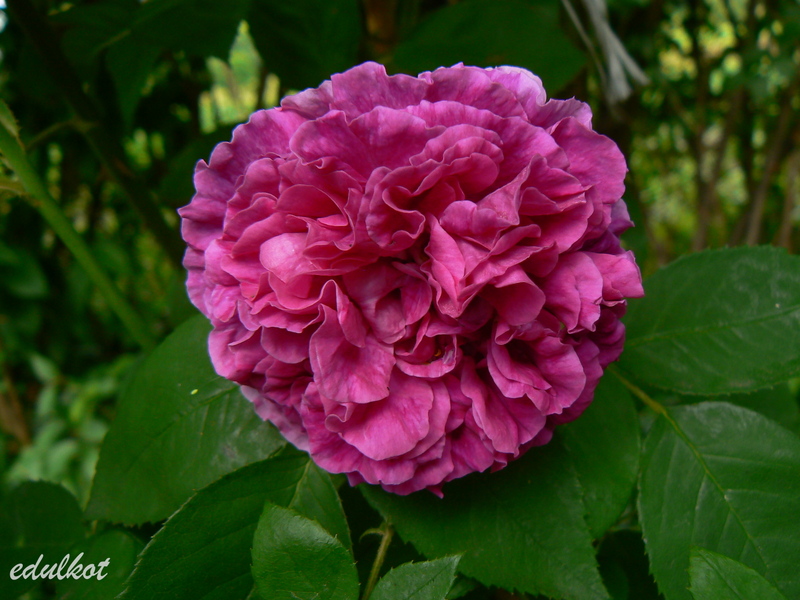 Kwiaty: średnie 3-4 cm, półpełne (16-25 płatków), szkarłatno-purpurowe, zmieniają się w ciemny fioletowo-różowe, kwitnie raz;