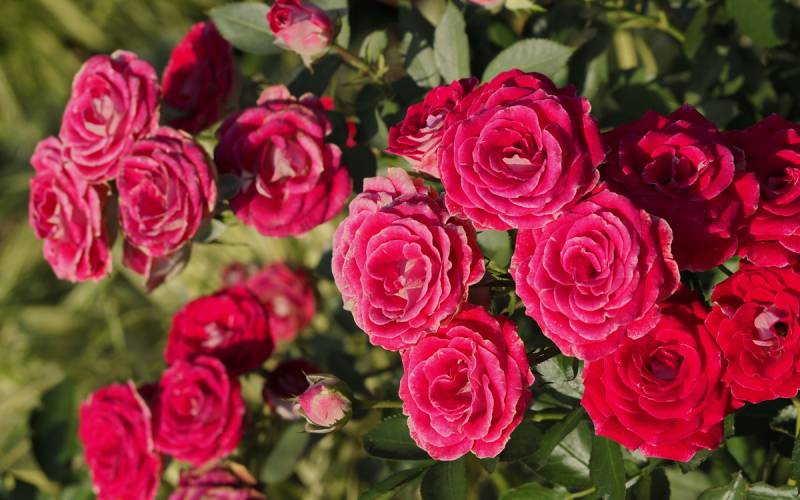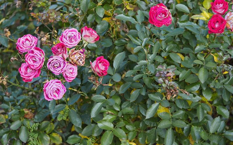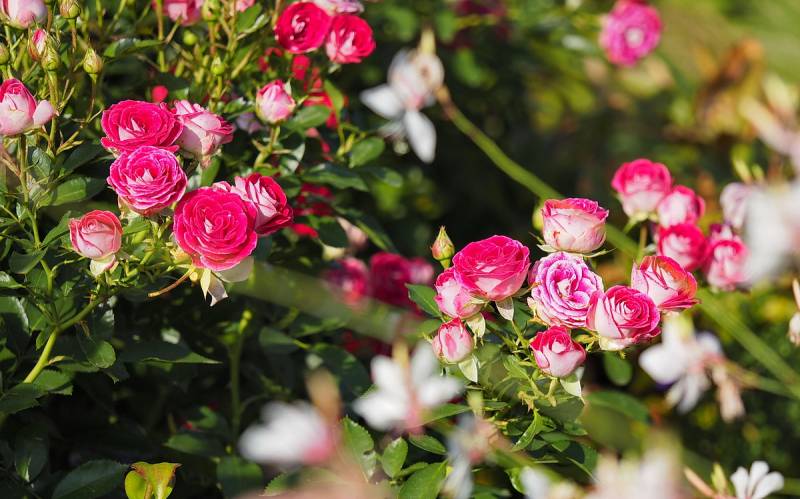 Kwiaty: Drobne średnicy 4-5 cm, pełne czerwono-białe zebrane po kilkanaście w kwiatostanie.