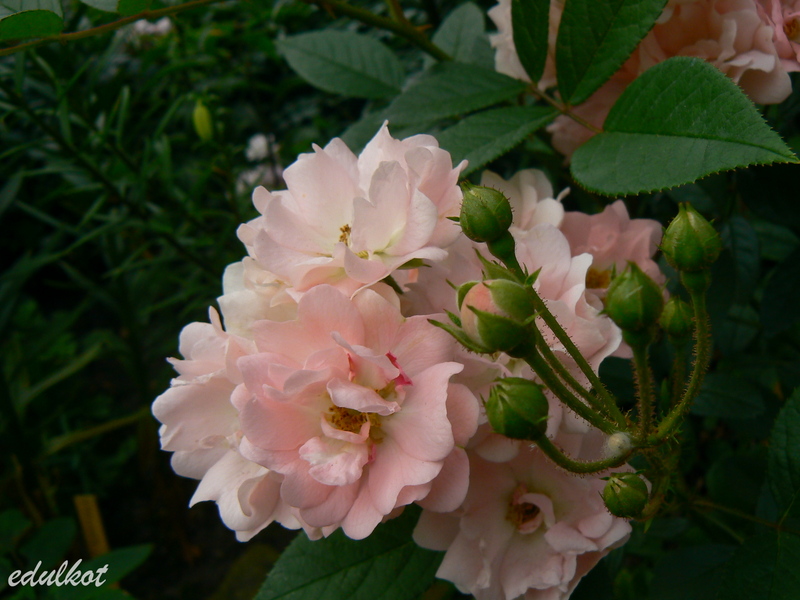 Kwiaty: małe 3-5 cm, półpełne (16-25 płatków), miseczkowate, różowo-pomarańczowo-łososiowe do białego, zebrane po kilkanaście na końcach pędów na kształt pomponików, powtarza kwitnienie;