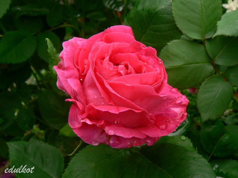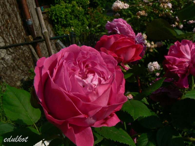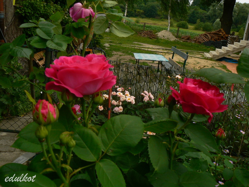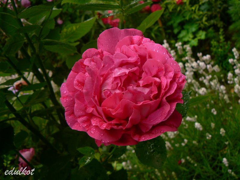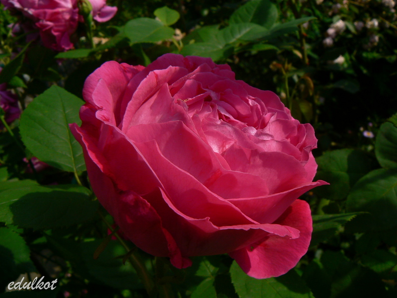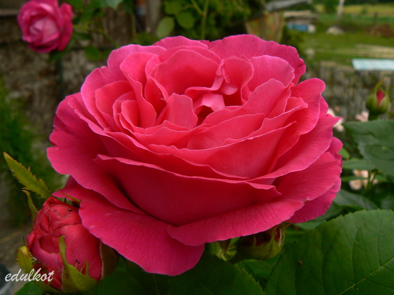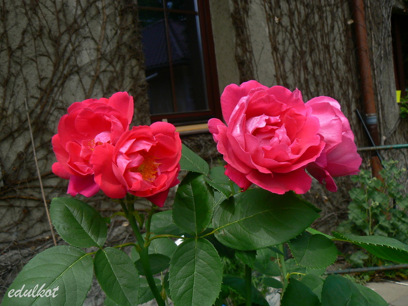 Kwiaty: duże, półpełne, miseczkowate, czerwono-ciemno-różowe tzw bouton rose, ciemniejsze delikatne paski, powtarza kwitnienie, prawie bezkolcowa;