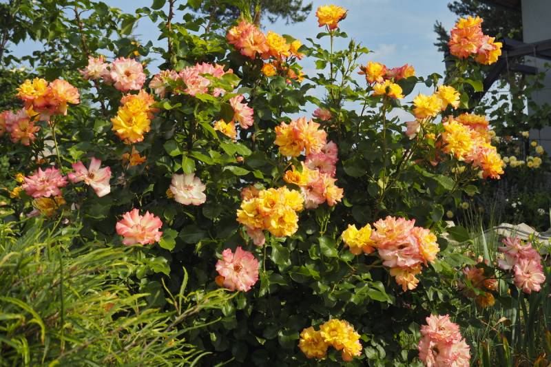 młode kwiaty jaskrawe, żółto-oranżowe, starsze kremowo-czerwone bardziej stonowane; pędy mocno kolczaste.