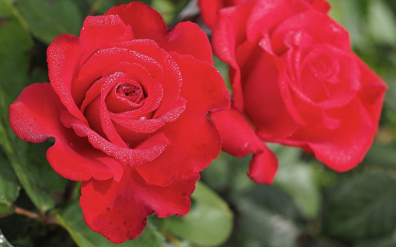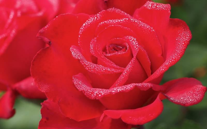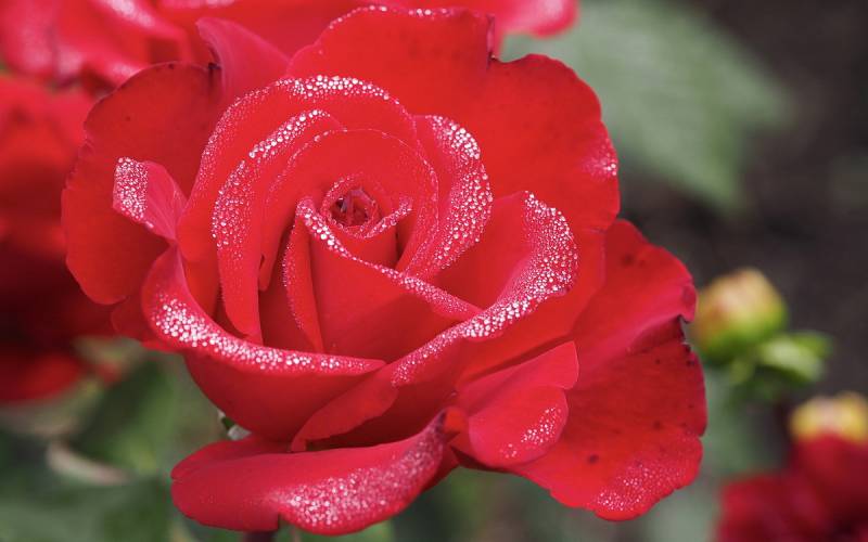 Kwiaty: jasnoczerwone, aksamitne, pięknie ukształtowane, zbudowane z 25-40 płatków ( Ø: 10 cm), kolor trwały, odporne zarówno na deszcz jak i na upały
