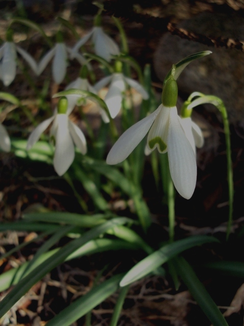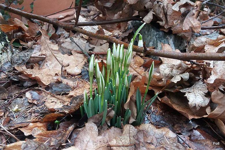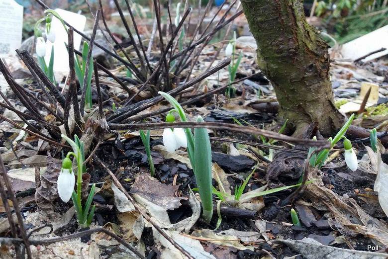 Pierwsze przebiśniegi - w bardziej słonecznych miejscach - już się pokazały i to zarówno gatunek Galanthus nivalis, jak tez jego odmiana pełna (jest nieco mniej zaawansowana w rozwoju).