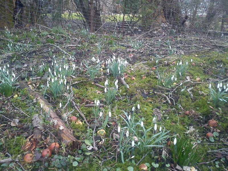 Sprawy wyglądają następująco: zawsze wydawało mi się, że przebiśniegi są dosłownie wszędzie i mieszkam w zagłębiu ale dziś, idąc z psem, patrzyłam pod kątem B) i to nie jest wcale takie oczywiste. Takie złoża jak u mnie lub przynajmniej ze zbliżonym potencjałem, są jeszcze u sąsiadki obok i na tzw. 'spalonym'- miejscu po dawnym gospodarstwie niemieckim.