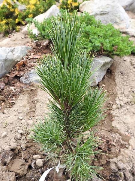 Sztywne, żywozielone i ostro zakończone igły zebrane są w pęczki po 5 na krótkopędach. Osiągają 7–9 cm długości i 1 mm szerokości, na przekroju są trójkątne, na brzegach delikatnie ząbkowane. Pochewki liściowe szybko opadają.
