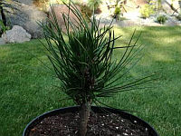 Igły zebrane w pęczki po 2, ciemnozielone, mocne i kłujące, długości 4,5–10 cm, grubości 1,5–2 mm.