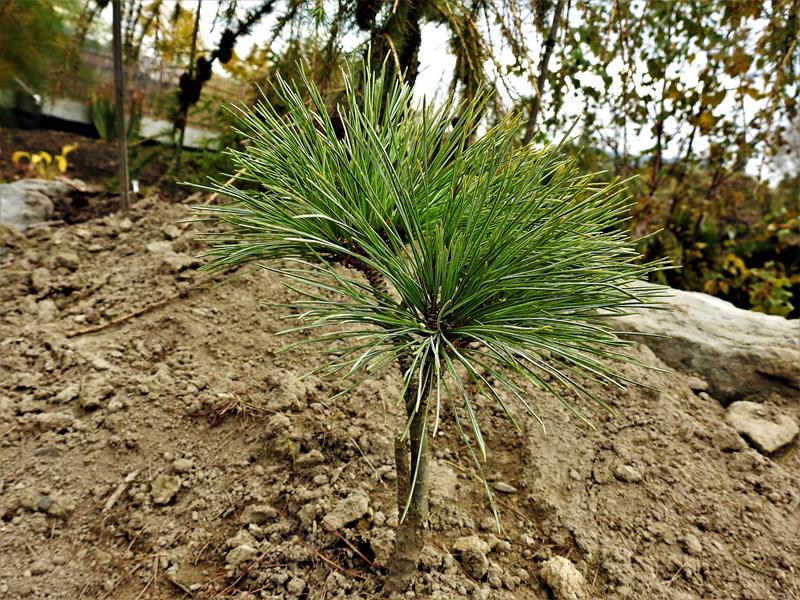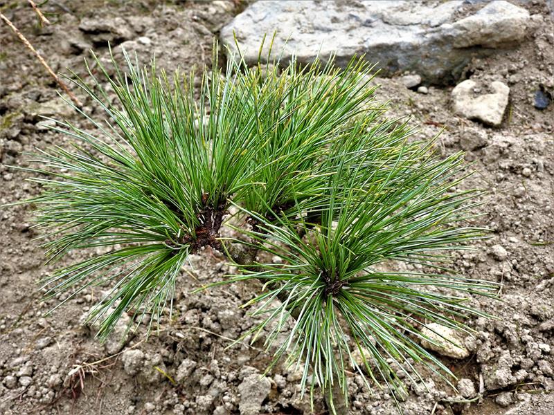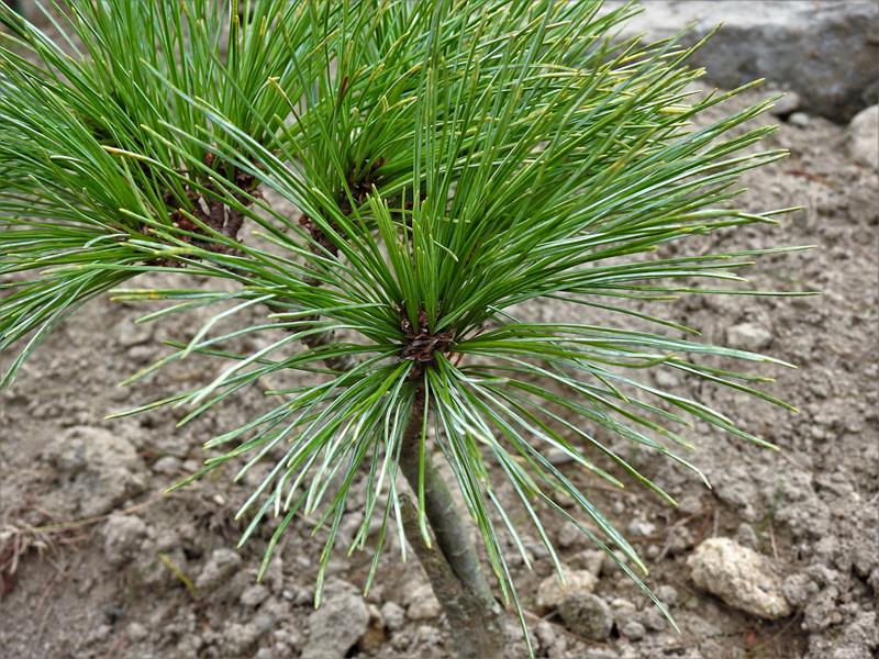 Liście: Igły długości 4–10 cm, szerokości 0,7–1 mm, zebrane w po 5 na krótkopędach. Proste, lekko skręcone, brzegiem ząbkowane, niebiesko-zielone.