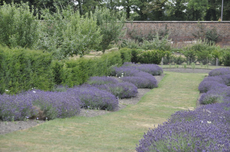 [1] Angielski ogród kuchenny otoczony murem z rabatami ozdobnymi oraz ziołowymi przy pałacu na Warmii, Polska.