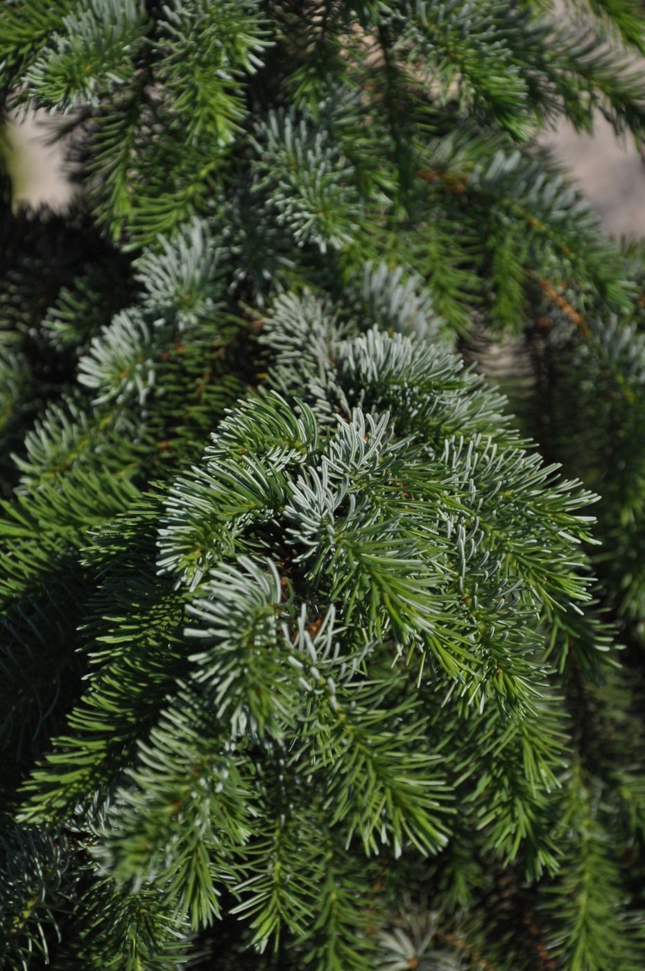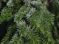 Krótkie (10-20 mm), zaostrzone igły, wyraźnie spłaszczone, zielone z wierzchu z dwoma białymi paskami od spodu. Na młodych pędach ułożone równomiernie dookoła, na starszych gałęziach układają się w boczne rzędy. Utrzymują się na drzewie nawet do 10 lat.