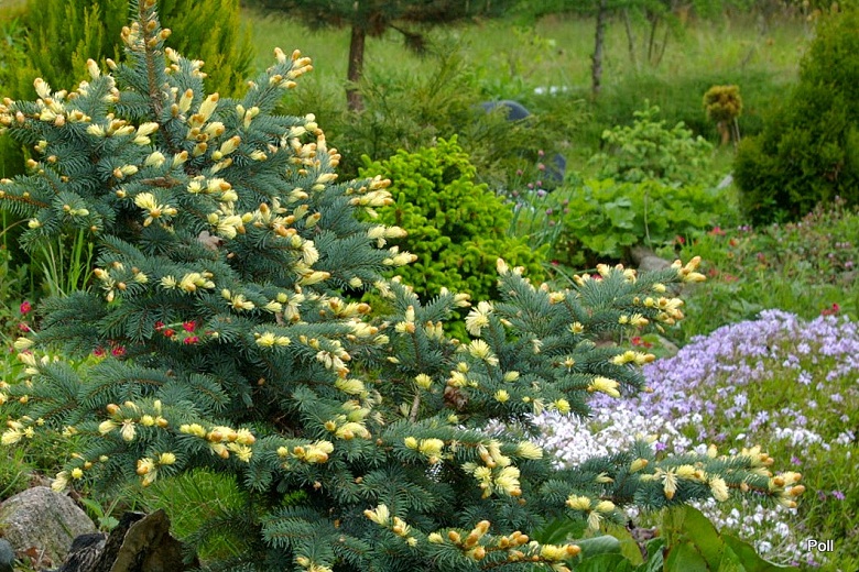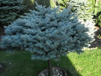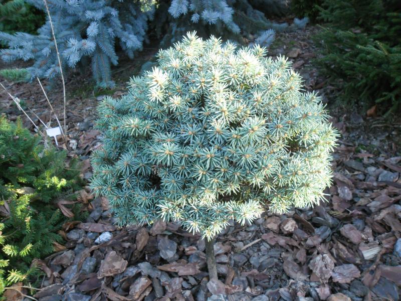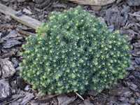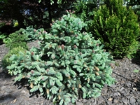 Rośnie w lekko spłaszczoną kulkę odznaczając się zielono-niebieską barwą igieł. Po 10 latach osiągnie wymiary 30x40 cm.