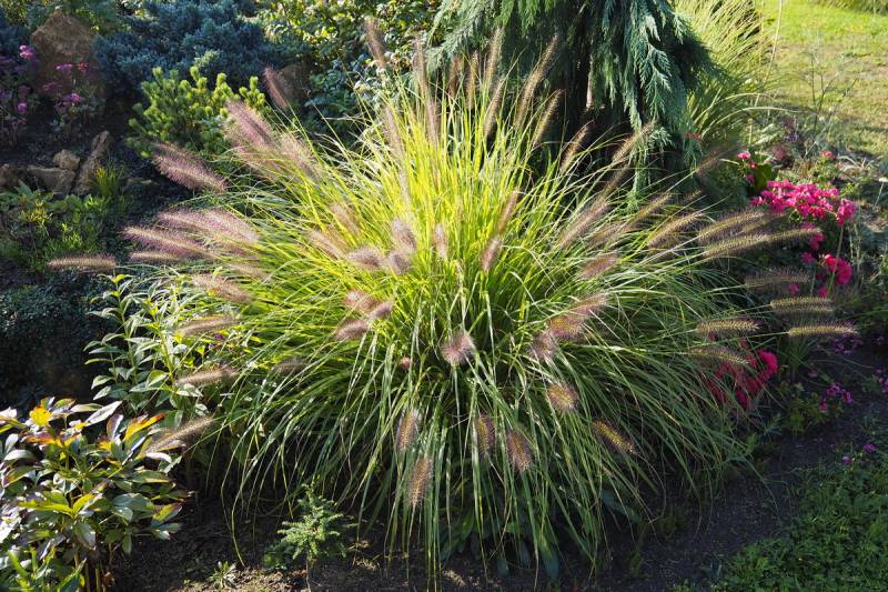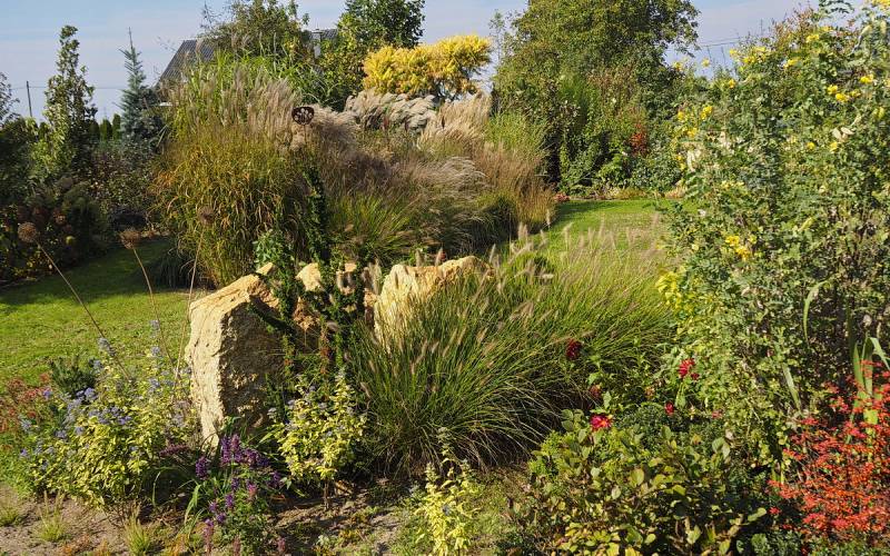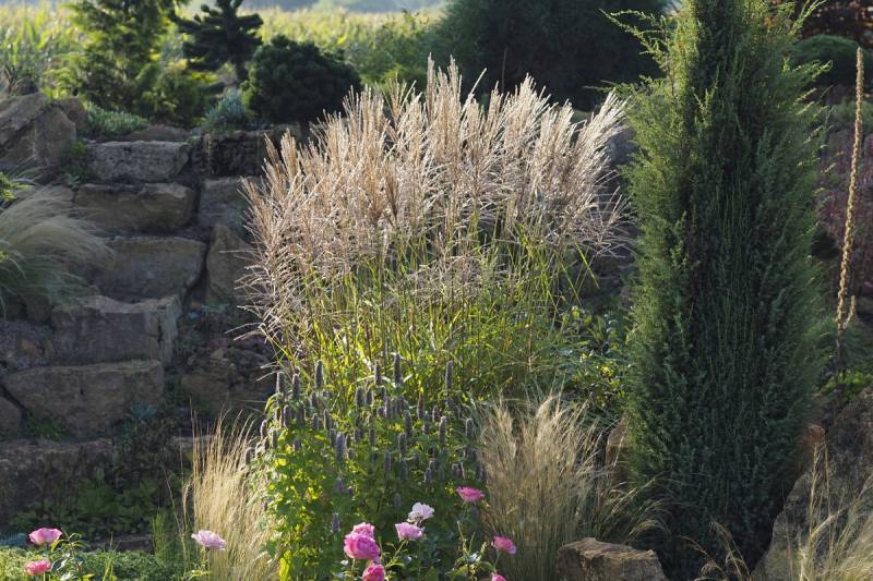 drugi z kwitnieniem zameldował się miskant Roter Pfeil - rośnie u podnóża skalniaka