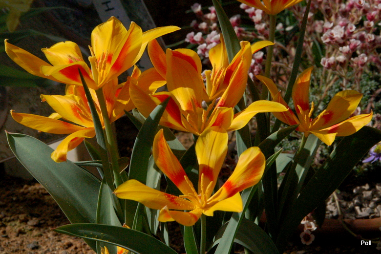 Tulipa fosteriana) - osiągają 30–40 cm, kwiaty ognistoczerwone, charakterystycznie rozwarte w drugiej fazie kwitnienia, liście z wąską brunatną obwódką. Kwitną na początku kwietnia.