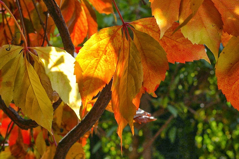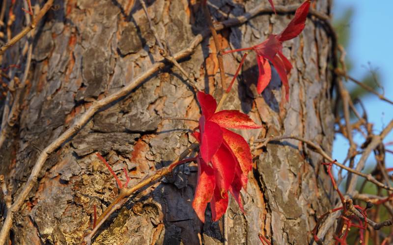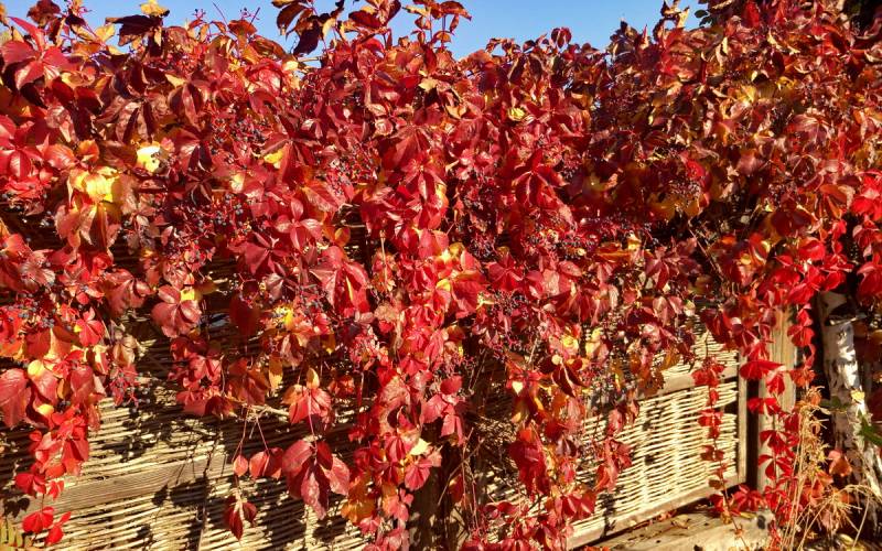 Widok czerwieniejących winobluszczowych listków i granatowych jagód, to dla mnie clou jesieni, zwłaszcza w słoneczne dni. Lubię go fotografować a przy tym wyszukiwać ciekawie wybarwione liście. Czerwienieją bowiem tam, gdzie dochodzą promienie słoneczne. Jeśli połowa liścia jest w słońcu a druga schowana pod innym liściem, mamy czerwono-zielony, jakby podkolorowany w photoszopie obrazek.