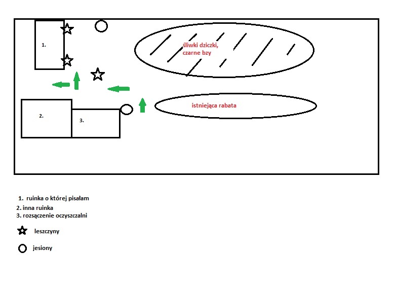 W miejscu ruinek, skoro nie zamierzasz oczyszczać tych miejsc - zrób skalniaki. Tylko zdaje się, że ruinka nr 1 jest w cieniu, dobrze myślę? Gdybym miała więcej czasu, to przygotowałabym Ci zestaw roślinek skalniakowych do cienia. Druga ruinka bardziej słoneczna, prawda? Tam nie będzie problemu, bo większość skalniaków lubi słońce. Do tego jakieś karłowe iglaczki