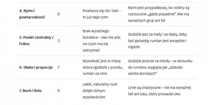 to klasyczny zestaw zasad zaczerpnięty z teorii projektowania krajobrazu i aranżacji roślin (bardzo zbliżony do zasad kompozycji w sztuce wizualnej, malarstwie czy fotografii, tylko dostosowany do ogrodu).Te zasady są uniwersalne – stosuje się je zarówno w małych rabatach bylinowych, jak i w dużych ogrodach naturalistycznych czy angielskich cottage garden. W praktyce prawie nigdy nie da się spełnić wszystkich na 100 %, ale im więcej z nich uwzględnisz, tym rabata wygląda bardziej „profesjonalnie” i przyjemnie dla oka. Oto krótki, jasny opis każdej z 7 zasad kompozycji ogrodowej, w formie, którą możesz sobie łatwo zapamiętać lub wykorzystać np. przy planowaniu rabat: 1.Jedność (Unity) Cała rabata powinna wyglądać jak jedna spójna całość, a nie jak kilka różnych kawałków. Osiąga się to przez powtarzanie tych samych kolorów, kształtów, tekstur lub stylu roślin – tak, żeby oko „rozumiało”, że to jedna kompozycja. 2. Równowaga (Balance) Rabata nie powinna „ciążyć” mocno w jedną stronę. Rozkład masy roślinnej, kolorów i wysokości powinien być zrównoważony – symetryczny (formalny) lub asymetryczny, ale wyczuwalnie stabilny wizualnie (naturalny). 3. Kontrast Rośliny różnią się od siebie na tyle, żeby się wzajemnie podkreślały: kontrast kolorów (jasny–ciemny), kształtów kwiatostanów (kłos vs talerz vs kula), faktur liści (gładkie vs puszyste vs sztywne), wysokości czy pokroju. 4. Rytm i powtarzalność Oko lubi „płynąć” po rabacie. Tworzy się to przez powtarzanie grup tej samej rośliny w odstępach (fale, rytmiczne powtórzenia) albo stopniowe zmiany wysokości/koloru, które prowadzą wzrok wzdłuż rabaty. 5. Punkt centralny / Fokus Rabata powinna mieć jeden (lub maksymalnie dwa) wyraźny punkt, swojego „bohatera” – miejsce, na którym oko zatrzymuje się jako pierwsze. To może być duża, efektowna roślina, mocny kolor, ciekawy kształt lub grupa w kontrastowym kolorze. 6. Skala i proporcje Rośliny powinny być dopasowane wielkością do siebie nawzajem i do otoczenia (np. nie sadzimy malutkiego goździka obok ogromnego słonecznika). Wysokość, szerokość i gęstość grup muszą być proporcjonalne, żeby nic nie wyglądało na „za małe” lub „za wielkie”. 7. Ruch i linie Kompozycja powinna prowadzić wzrok – łagodnymi krzywiznami, falami wysokości, skośnymi liniami grup roślin. Unikamy sztywnych, prostych rzędów (chyba że celowo formalny ogród) i chaotycznego „wszystko na raz”. Pokusiłam na ocenę tego fragmentu rabaty według wyżej wymienionych kryteriów dla dobra nauki i planowania, żeby dać przykład. Średnia ocena z tej tabeli (zasady 1–7) dla mojego zdjęcia wynosi 5,57/10. To plasuje rabatę w kategorii „ładna, naturalna, ale jeszcze chaotyczna i bez wyraźnej struktury”. Nauczycielka na emeryturze |