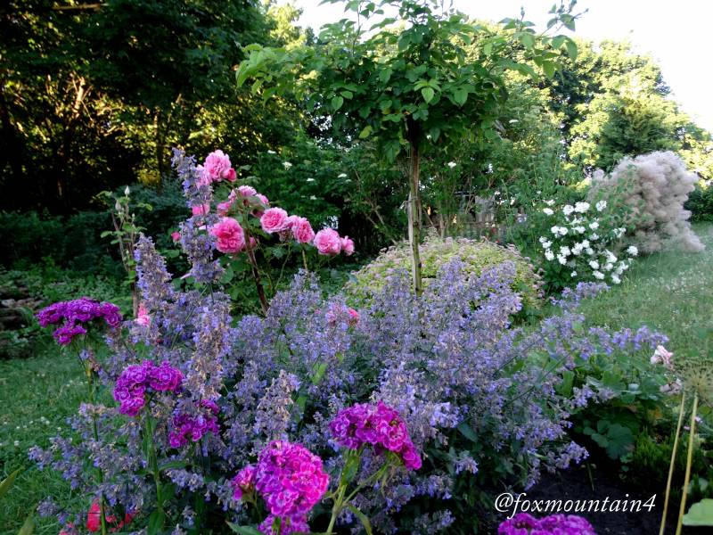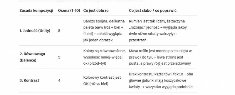 Co bardzo dobrze wygląda i działa :Piękna, spójna kolorystyka oparta na różu, fiolecie i odrobinie bieli – to bardzo klasyczne, spokojne i eleganckie połączenie, które świetnie się starzeje i nie męczy oka. Róże (różowe róże), fiolet lawendy/szałwii, purpurowe goździki ( Dianthus), jasnofioletowe kępy (prawdopodobnie szałwia omszona lub podobna bylina), biel jasminowca– całość jest harmonijna i „oddycha”,daje bardzo przyjemnie wrażenie . Duża ilość powtórzeń tych samych kolorów w różnych fakturach i wysokościach → daje poczucie spójności i naturalnego przepływu koloru przez rabatę. Bardzo ładne wykorzystanie pionowych akcentów – róża na pniu oraz wysoki, zwiewny element z tyłu (tawułka) przełamują płaskość i dodają rabacie głębi oraz lekkości. Dobrze widoczna warstwowość w środkowej i tylnej części – niższe kępy fioletu idą w górę w kierunku jaśniejszych i wyższych partii, co optycznie powiększa rabatę i prowadzi wzrok. Naturalny, trochę „dziki” charakter – dużo liści, prześwity, brak sztywnych linii – to bardzo dobrze pasuje do wiejskiego / naturalistycznego stylu ogrodu i do wieczornego światła, w którym zdjęcie jest zrobione. Co można by uznać za słabsze punkty kompozycji (lub miejsca do dopracowania): Najbardziej widoczny mankament to brak wyraźnego „pierwszego planu” i zbyt gwałtowne przejście od najniższych roślin do tych średnich/wyższych. Z przodu rabaty (tam, gdzie jest skierowany aparat) mamy od razu dość wysokie kępy (fioletowe ~40–60 cm + różowe goździki ~30–50 cm), a brakuje wyraźnej, niskiej obwódki (10–25 cm), która „wpuściłaby” wzrok do środka rabaty i trochę ją wyciszyła od dołu. Typowe rośliny na przód to np. smagliczka, dzwonek karpacki, żurawka, barwinek, niskie goździki, macierzanka, czy nawet niskie trawy ozdobne. Lekko chaotyczne rozmieszczenie w poziomie – widać, że fioletowe kępy są dosyć mocno skoncentrowane w jednym miejscu (duża plama purpury po lewej i w centrum), a róż i biel są bardziej rozproszone. W naturalistycznym stylu to dopuszczalne, ale przy odrobinę większej powtarzalności (np. 3–5 mniejszych plam tego samego gatunku zamiast jednej wielkiej) rabata zyskałaby na czytelności i rytmie. Brak wyraźnych „spokojnych oddechów” (przestrzeni zieleni / szarości / srebra) – prawie cała powierzchnia jest kwiatowa i kolorowa. W środku lata to może być bardzo efektowne, ale pod koniec sezonu (gdy część przekwitnie) rabata może wyglądać na „przepełnioną” i zmęczoną. Wprowadzenie większej ilości szarych/srebrzystych liści (np. bylica ‘Powis Castle’, stachys, szałwia argentea, kocimiętka ‘Walker’s Low’ w większej ilości) albo większych plam traw (np. stipa, molinia, hakonechloa) bardzo często ratuje takie gęste rabaty. Wysoki element z tyłu (tawułka) jest tylko jeden i trochę „wisi” samotnie – w większej rabacie lepiej mieć 2–3 takie pionowe akcenty rozstawione w odstępach, wtedy kompozycja staje się bardziej stabilna i zrównoważona. Podsumowując w jednym zdaniu: To bardzo ładna, ciepła i naturalna rabata z bardzo udaną kolorystyką różowo-fioletową, która świetnie wygląda w świetle – brakuje jej głównie wyraźniejszej, niskiej warstwy na pierwszym planie oraz odrobiny „oddechu” wśród liści/traw, żeby nie było aż tak bardzo, że „wszystko kwitnie naraz”. Ocena rabaty w skali 1–10, biorąca pod uwagę wszystkie typowe kryteria kompozycji rabaty bylinowej w stylu naturalistycznym/angielskim (czyli nie sztywny klomb, tylko swobodny ogród). Ocena końcowa: 7,5/10 Rozbicie punktowe (każde kryterium na 10, potem średnia ważona): Kolorystyka i harmonia barw → 9/10 Bardzo ładne, spójne, spokojne połączenie różu + fioletu + bieli. Klasyka, która się nie nudzi i dobrze wygląda w różnych porach dnia. Mały minus tylko za to, że prawie zero akcentów srebrzystych/szarych/zielonych liści, które podbiłyby całość jeszcze bardziej. Warstwowość → 7/10 Jest wyraźna warstwa tylna i środkowa, pionowy akcent (róża na pniu + wysoka bylina) – to plus. Ale przód jest za wysoki i zbyt gwałtownie ]startuje – brakuje niskiej „obwódki” 15–30 cm, która prowadzi wzrok i daje rabacie „stopy”. Rytm i powtarzalność roślin → 6,5–7/10 Powtarzanie koloru jest, ale plamy są trochę zbyt duże i nierównomiernie rozłożone (duża „kałuża” fioletu w centrum-lewo). W naturalistycznym stylu 3–5 mniejszych powtórzeń tego samego gatunku/koloru daje lepszy rytm i czytelność. Gęstość i „oddech” kompozycji → 6/10 Obecnie prawie 100% powierzchni to kwiaty i to w szczycie lata wygląda obłędnie, ale rabata jest na granicy przepełnienia. Brakuje większych plam liściastych, traw ozdobnych lub srebrzystych bylin, które dałyby oku odpoczynek i zapewniłyby atrakcyjność po przekwitnięciu głównych gwiazd. Struktura i stabilność kompozycji → 7,5/10 Jeden mocny pionowy akcent to za mało na rabatę tej wielkości – lepiej mieć 2–3 rozstawione punkty uwagi. Reszta trzyma się dobrze, nie ma wrażenia chaosu. Efekt ogólny, nastrój, „wow” w świetle → 8,5–9/10 Zdjęcie oddaje dokładnie to, co w takich rabatach kochamy – ciepło, obfitość, lekkość, swojskość. W tym oświetleniu wygląda naprawdę pięknie i zapraszająco. Podsumowanie skali: 8,5–9 → rabaty, które są bliskie ideału w swoim stylu (bardzo dobra warstwowość, rytm, oddech, struktura) 7–8 → ładne, bardzo udane rabaty z drobnymi mankamentami ( aktualna sytuacja) poniżej 7 → widoczne problemy z kompozycją Rabata mieści się solidnie w górnej części „bardzo dobrych” – 7,5/10 to uczciwa ocena. Przy dodaniu niskiej obwódki na przodzie (np. smagliczka, niskie goździki, żurawka, barwinek, macierzanka) + wprowadzeniu 20–30% więcej liści/traw/srebra podbiłaby łatwo do 