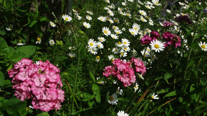 Zacznijmy od zdjęcia, które pokazuje bardzo ładny, naturalistyczny border w stylu łąkowym / wiejskim – pastelowe, delikatne kolory (róż + biel + odrobina fioletu), kwitnienie w tym samym czasie i ma dobrą gradację wysokości od przodu. To już solidna baza, która dobrze wygląda i jest spójna wizualnie. .Co konkretnie jest mocną stroną (czyli dobrze): Kolor: Pastelowa, bardzo przyjemna dla oka paleta barw – róż goździka brodatego (Dianthus barbatus) + biel rumianu + drobne akcenty fioletu ( kocimiętka w tle= klasyczny, romantyczny, bardzo „angielski” klimat. Sezonowość : Kwitną jednocześnie → duży plus, bo rabata ma teraz mocny moment „wow”. Piętrowość: Wysokość jest w miarę poukładana – goździk z przodu rumian trochę za nim i z boku, całość nie jest zbyt chaotyczna. Co bym delikatnie poprawiła, (najważniejsze rzeczy): Grupowanie: Rumian jest za dominujący (za dużo go w stosunku do reszty).To klasyczny przypadek typu „kłopoty bogactwa” – jedna roślina przejmuje całą rabatę i zagłusza pozostałe. Rumian pospolity bardzo łatwo się rozsiewa i w drugim-trzecim roku potrafi zdominować 50–70% powierzchni, jeśli nie kontrolujemy siewek. → Rozwiązanie teraz: W przyszłym sezonie usunąć / przesadzić część kęp rumianu (zostawić ok. 40–50% obecnej ilości). → Posadzić go w większych, ale świadomych grupach po 5–9 szt., a nie „wszędzie po trochu”. Goździk brodaty jeszcze za młody i za mały. Jednoroczne/dwuletnie goździki brodate potrzebują zwykle 1 sezonu, żeby się naprawdę rozrosnąć i stworzyć pełną, zwartą „kulę” kwiatów. Teraz wygląda trochę „blado” w porównaniu z rumianem. → potrzebny jest jeszcze ten rok – w przyszłym sezonie powinien być 2–3× większy i bardziej okazały. → Jeśli chcę mieć szybciej efekt – mogę posadzić w tym samym kolorze jeszcze 3–5 dodatkowych sadzonek obok obecnej grupy (rozstaw 20–25 cm). Różnorodność kształtów i faktur: Brak kontrastu faktur / kształtów kwiatostanów. Oba dominujące gatunki mają koszyczki / baldachy i całość jest dość podobna wizualnie. Brakuje „przecięcia” kształtem". → Prosi się dodanie czegoś o innym pokroju kwiatostanu, np.: szałwia omszona / szałwia łąkowa (wys. 40–60 cm, pionowe kłosy, fiolet/lawenda) kocimiętka (Nepeta) – szarawo-zielona mgiełka + fioletowe drobne kwiaty jeżówka albo rudbekia w pastelowej odmianie (jeśli chcemy zostać przy delikatnych kolorach) trawa ozdobna niska (np. imperata cylindryczna ‘Red Baron’ albo stipa tenuissima) – doda ruchu i innej faktury ewentualnie łubin karłowy lub czeremcha. Zielona masa / liście – trochę za mało Po przekwitnieniu rumianu i goździka rabata może zrobić się bardzo pusta i brązowa. → Warto wpleść 1–2 gatunki o ładnych, długo utrzymujących się liściach lub powtarzającym kwitnieniu: żurawka (Heuchera) – purpurowe/czekoladowe liście funkia (Hosta) – jeśli jest trochę półcienia czyściec wełnisty (Stachys byzantina) – srebrzysta „poduszka” niskie trawy (Sesleria, Festuca) Podsumowując: mam już naprawdę ładną, pastelową rabatę – wystarczy ją tylko trochę „wyciszyć” (mniej rumianu) i „wzmocnić” (więcej goździka + 1–2 kontrastowe kształty). Za rok-dwa będzie wyglądała profesjonalnie i bardzo naturalnie. Zależnie od tego, jak dalej planuję tę rabatę – czy ma być bardzo łąkowa i dzika, czy bardziej poukładana i „angielska” mogę dobierać kolejne dodatki. |