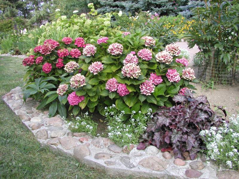 Chocolate Ruffles - wygląda spod hortensji, którą nazywam "Chełmska", ponieważ tam jest b. popularna i stamtąd ze mną przyjechała.