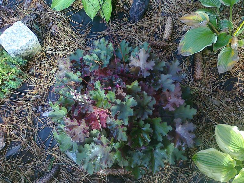 Rodzaj: Żurawka (Heuchera) Odmiana: Rex Red Wymiary : tworzy kępy o szerokości 50 cm i wysokości 50 cm/70 cm z kwiatostanem. Kolorystyka: liście purpurowo-zielono-brązowe. Kwiaty: jasnoróżowe. Warunki: pół-cieniste/słoneczne. Kwitnienie: od maja.