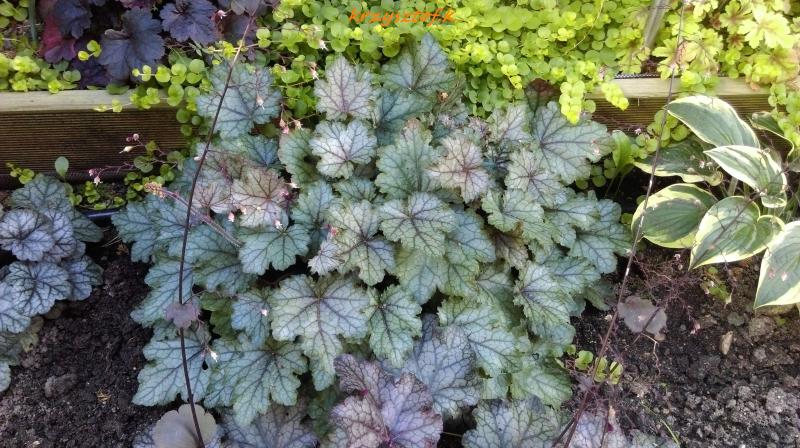Rodzaj: Żuraweczka (Heucherella) Odmiana: Cracked Ice Wymiary : odmiana tworząca kępy o szerokości 40 cm i wysokości 15-20 cm/ 25 cm z kwiatostanem. Kolorystyka: liście srebrno-zielone z fioletowym marginesem i ciemnym żyłkowaniem . Kwiaty: białe. Kwitnienie: od czerwca do lipca. Warunki: stanowisko pół-cieniste/cieniste.