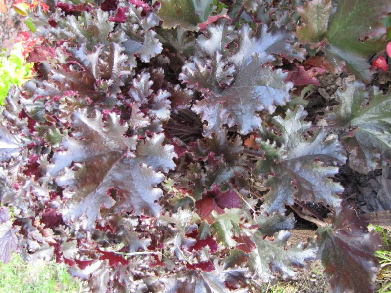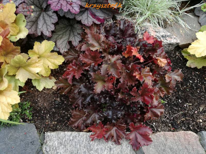 U mnie z racji tego że rośnie na pólcienistym stanowisku liście raczej ciemno-purpurowe a nie czarne, duże, pofałdowane, karbowane. Dorasta do 30 cm wysokości i 40 cm szerokości. Rośnie zdrowo, dość szybko przyrasta.
