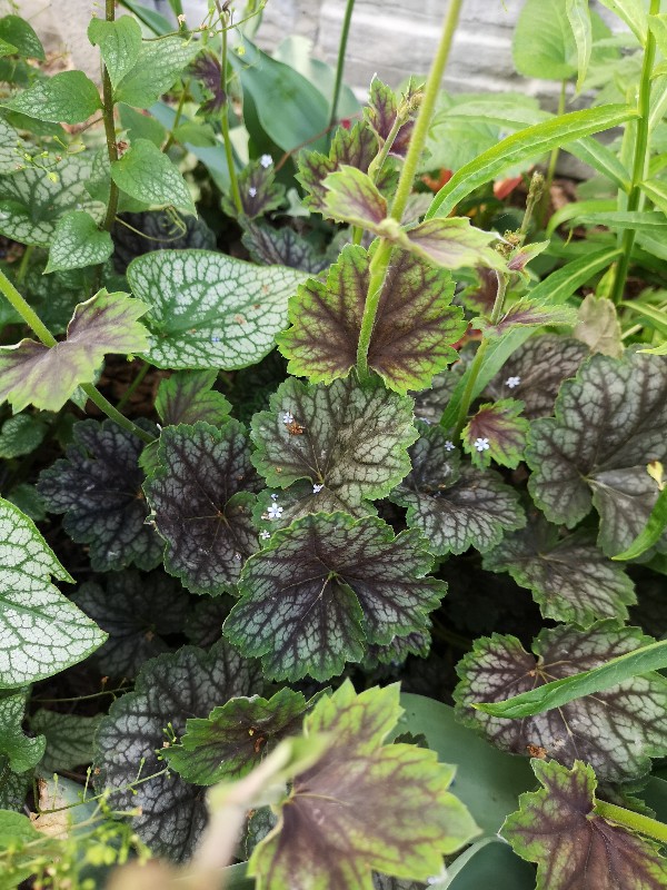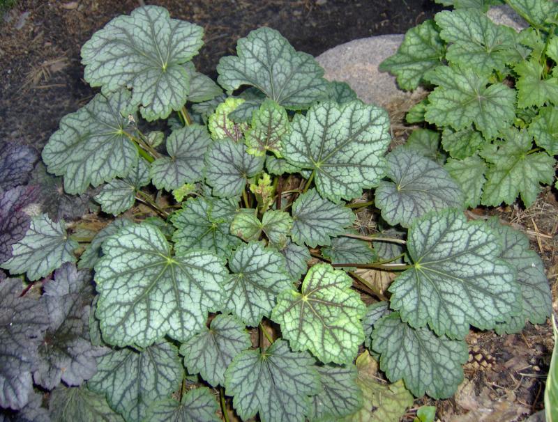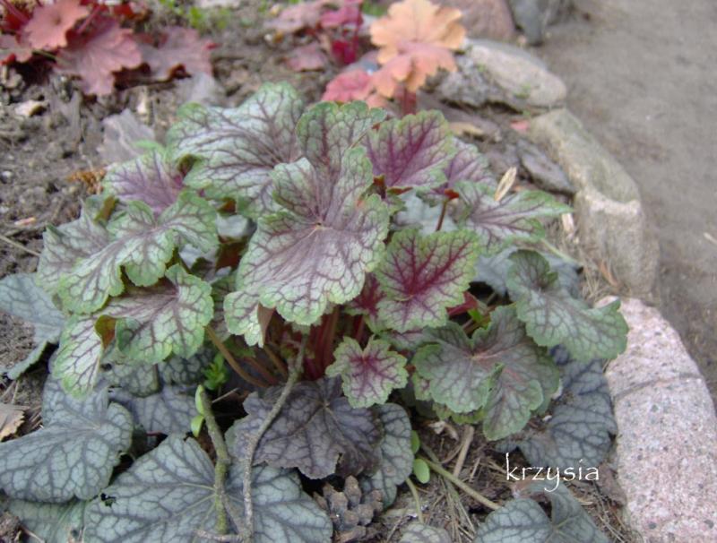 Rodzaj: Żurawka (Heuchera) Odmiana: Green Spice Wymiary : tworzy kępy o szerokości 40 cm i wysokości 25 cm . Kolorystyka: białe kwiaty. Liście metaliczne z mocno zaakcentowanym,szczególnie wiosna, zielonym marginesem z mocno kontrastowym, czerwonym unerwieniem . Warunki: stanowisko cieniste/pół-cieniste/na słonecznym wymaga wilgotniejszej gleby. Kwitnienie:maj/czerwiec.