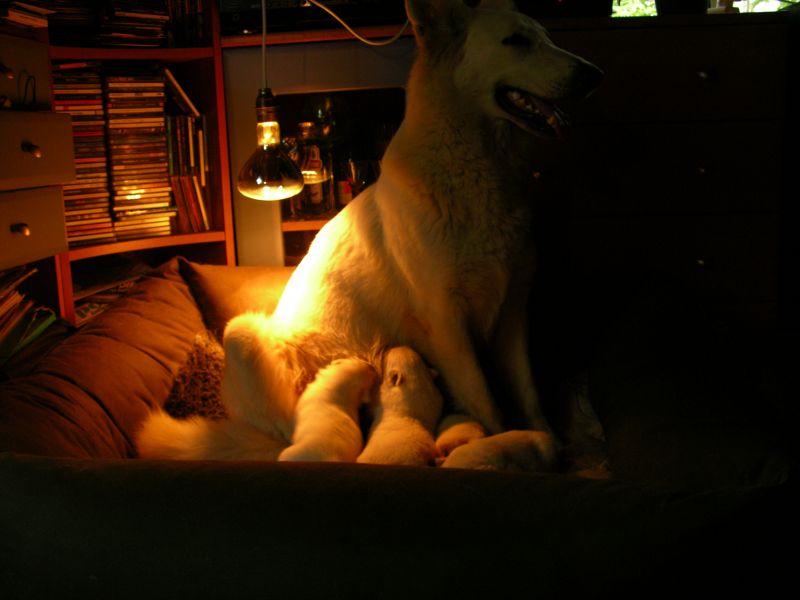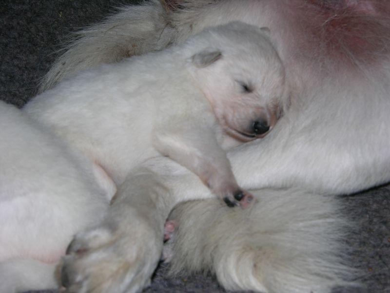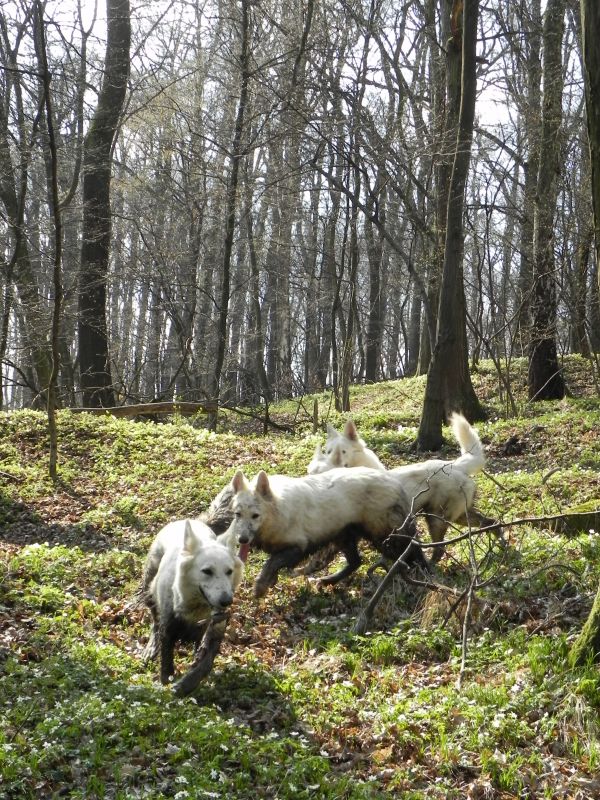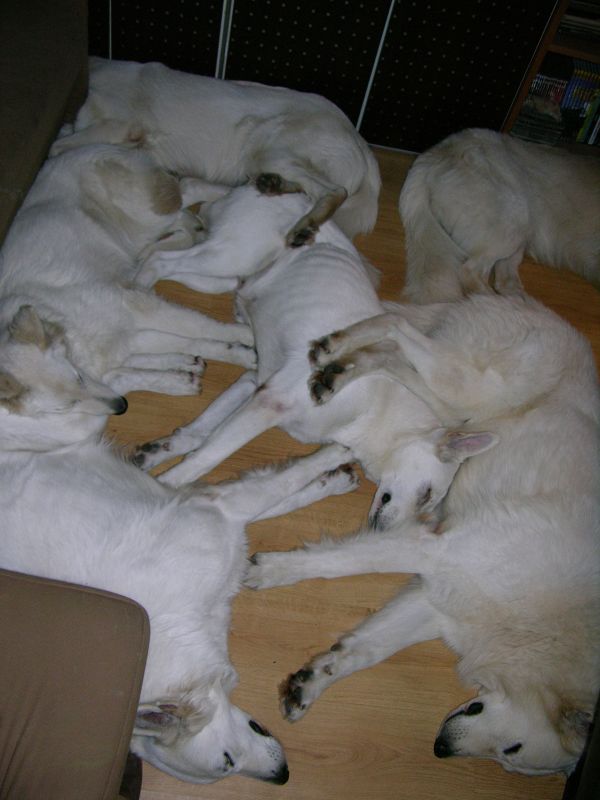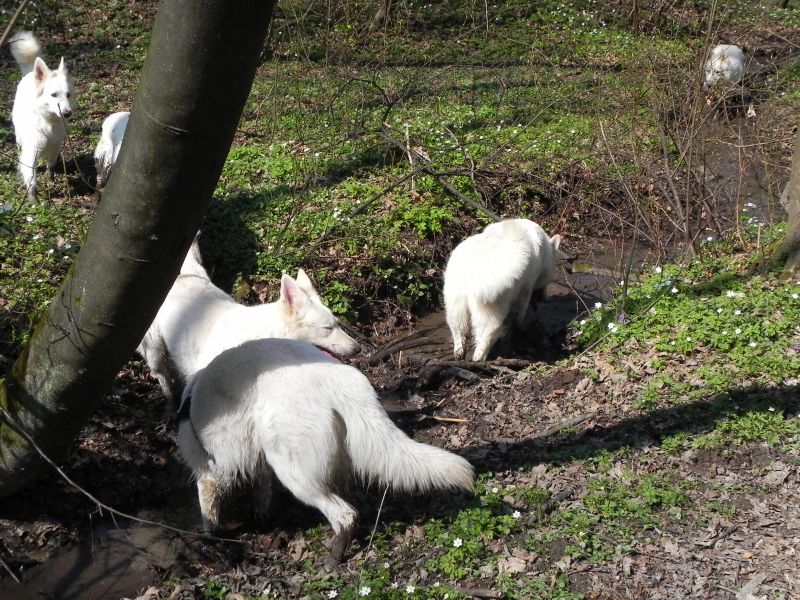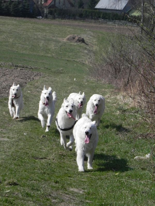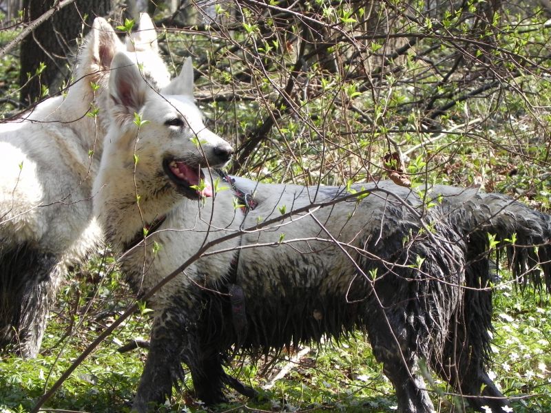 Przy takich panierkach przede wszystkim przydają się szampony tzw. "dirty dog", to są szampony bardzo mocno i dogłębnie myjące, usuwające cały brud, ale także całą warstwę tłuszczową, Po myciu takim szamponem robi się drugie mycie szamponem dopasowanym do szaty. Przy białych owczarkach najczęściej używa się szamponów wybielających, mają one najczęściej kolor granatowy, ciemnofioletowy lub butelkowozielony. Są to bardzo silnie skoncentrowane szampony, które MUSZĄ być rozcieńczane przed użyciem (nawet 1:20). Użycie skoncentrowanego szamponu kończy się niebieskimi albo zielonymi plamami na sierści, oczywiście nie takimi bardzo kolorowymi, ale widać że pies jest w plamy (nie wspomnę o uszkodzeniach włosa). Po takim myciu na włos nakłada się odżywkę dopasowaną do rodzaju szaty, przy szwajcarach to często odżywki do szaty podwójnej. Na szczęście szwajcary, pomimo białego koloru, nie są tak wymagające "picowania" jak inne rasy. Moje "matołki" też są nieczęsto kąpane, teraz mniej jeździmy na wystawy, to i takiego musu nie ma. A że jest to dla mnie coraz bardziej uciążliwe to i częstotliwość mniejsza. Mam niestety wannę i wsadzenie do niej takiego np.Maćka, który waży prawie 50 kg, a potem kilkukrotne namoczenie tej góry futra kończy sie takim bólem mojego kręgosłupa, że - same rozumiecie - nie śpieszę się do tego