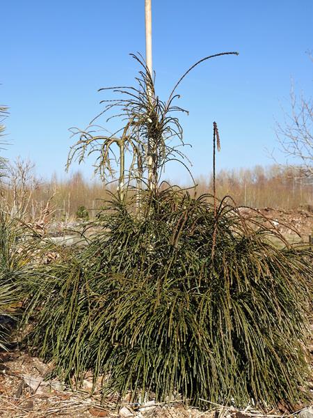 Korona gęsta, zwarta, regularnie stożkowata. Samotnie rosnące drzewa zachowują gałęzie do samej ziemi.